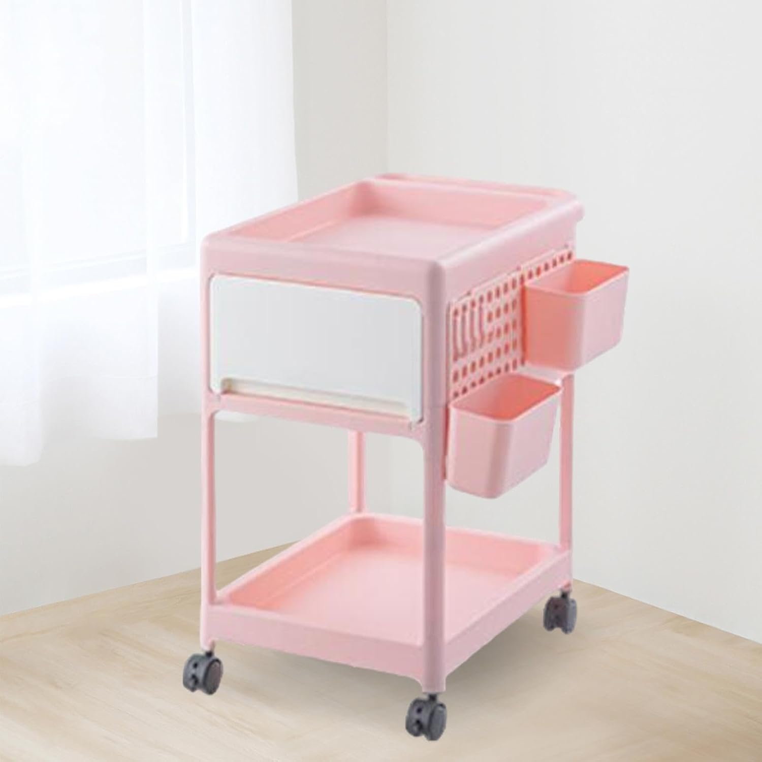 Description: - 【Multipurpose】: Our multipurpose storage cart is great for storing diaper baby nursery, makeup, snacks, and books in your living room or bedroom. - 【2 Tier】: 2 Layer trolley baby supplies storage rack bedroom snack bottle drawer distributor. - 【Drawer design】: The 2 Tier Rolling Cart design drawer and hook, unlimited position, can be placed up and down,. - 【Movable】:Drawer Organizers Trolley Featuring quiet omnidirectional wheel for smooth movement, can also be fixed and locked without running. - 【Application】: Bedside Organizer Shelf suitable for narrow space, our Kitchen Storage Organizer is ideal for use in bathrooms, bedroom, kitchens, living room, and children's room, and is easy to install.Specification: - Material:PPSize Chart:32cmx46cmx55cm/12.60inchx18.11inchx21.65inchPackage Includes:1 2 Tier Rolling CartNote:Please allow slightly errors due to manual measurement and different monitors.