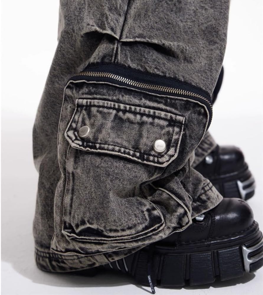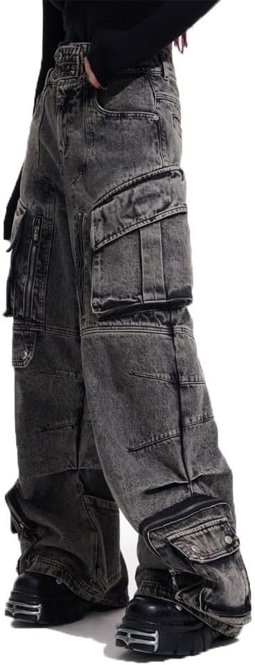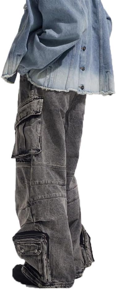 DYYLZYJ Mens Jeans Wide Leg Baggy Loose Fit Y2K Grunge Denim Cargo Pants with Pockets Wash water to make old straight leg denim work pants, loose high street trendy pants, washed multi pocket wide leg pants