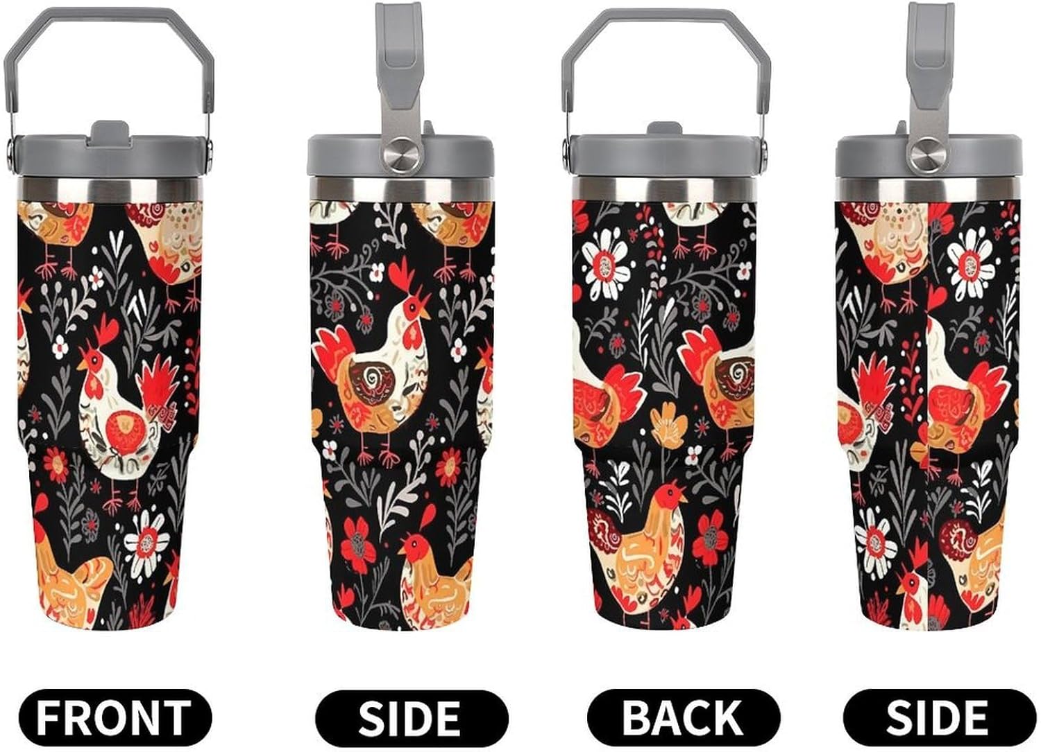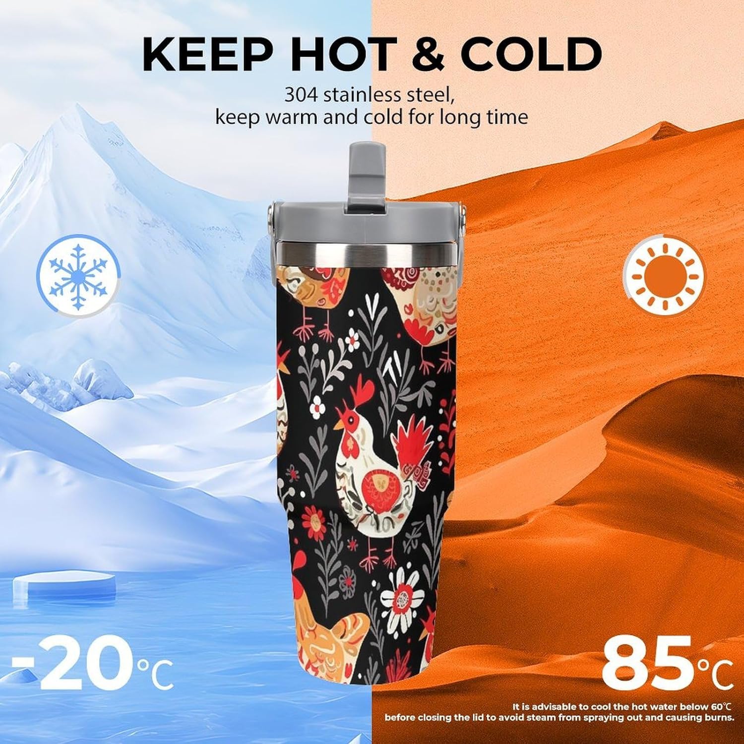 Our Cute Rooster Chickens travel water bottle is made of food-grade stainless steel. The wide mouth design makes it easy to clean and add ice, and the powder-coated exterior is non-slip and durable, ensuring driving safety.Whether you prefer sipping or quenching your thirst, this personalized insulated mug has you covered. Featuring a splash-proof straw design, a sealing ring securely holds the reusable straw, and a drinking spout and full-coverage lid for enhanced leak-proof performance, this mug allows you to easily carry ice water to work, meetings, the gym, or on trips.You can give it to your friends and family as a birthday, Mother's Day, Father's Day, New Year's, Thanksgiving, and holiday gift. It's a thoughtful present.