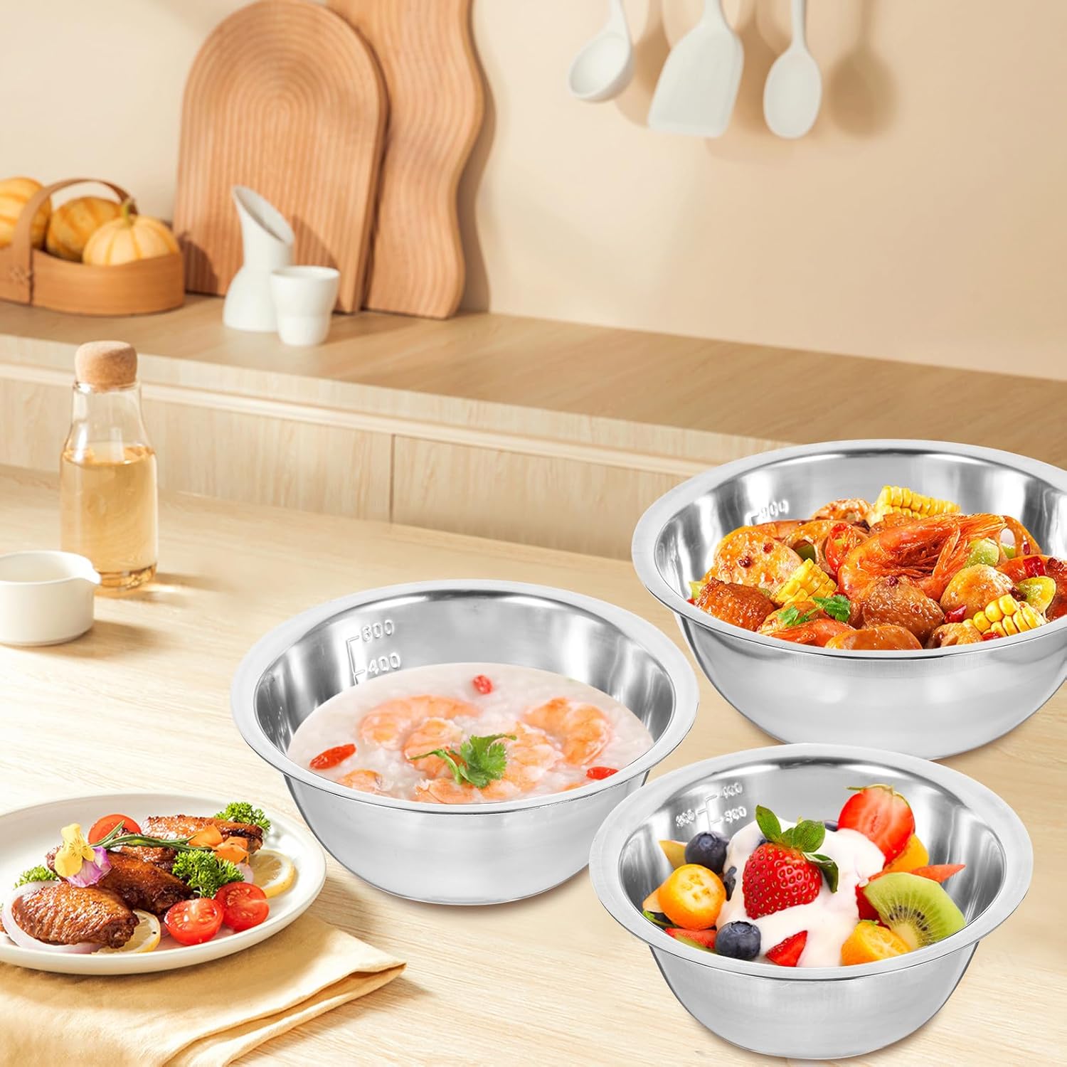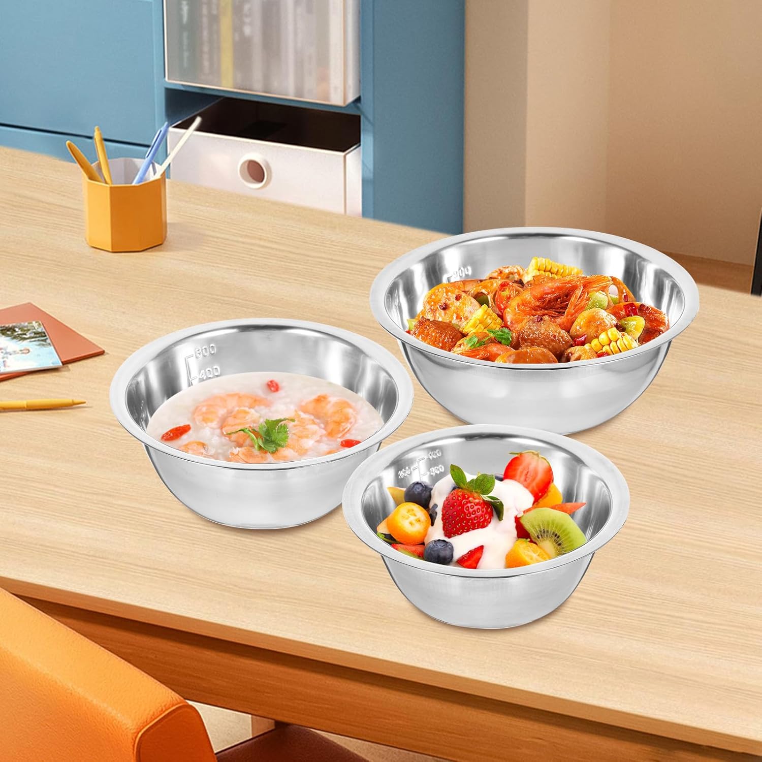 Package Include 1 x 580ml stainless steel mixing bowl 1 x 900ml stainless steel mixing bowl 1 x 1600ml stainless steel mixing bowl 1 x 2050ml stainless steel mixing bowl 1 x 2600ml stainless steel mixing bowl Characteristics - Size: 14.00X14.00X5.50cm/5.50X5.50X2.16in - Size: 24.00X24.00X8.50cm/9.43X9.43X3.34in -Product Info:Salad basin seasoning tank - Size: 16.00X16.00X6.00cm/6.29X6.29X2.36in - Size: 20.00X20.00X7.50cm/7.86X7.86X2.95in - Material: Stainless steel - Color: Silver - Size: 21.80X21.80X8.00cm/8.57X8.57X3.14in -Large capacity, convenient use of flour mixing, etc, which can bring you huge convenience stainless steel food containers. - Owning the strong wear and break resistance ability, very practical, with excellent texture stainless steel nesting bowls. -The salad mixing bowl is suitable for home, restaurant, dining room and some other places seasoning mixing bowl. -Easily mix your cake batters, cookie ingredients, salad, or make sauces and dressings inside the bowl kitchen bowl. -This deep bowl allows you to mix almost anything without the mess, perfect for kitchen use stainless steel salad bowl.Goods Descriptionstainless steel bowls The large capacity means you can put of foods into it.kitchen bowl Perfect for holding salad, noodle, soup, mixing egg, rice, etc.mixing bowls These mixing bowls are made of stable material, and to use.mixing would be a nice helper for you