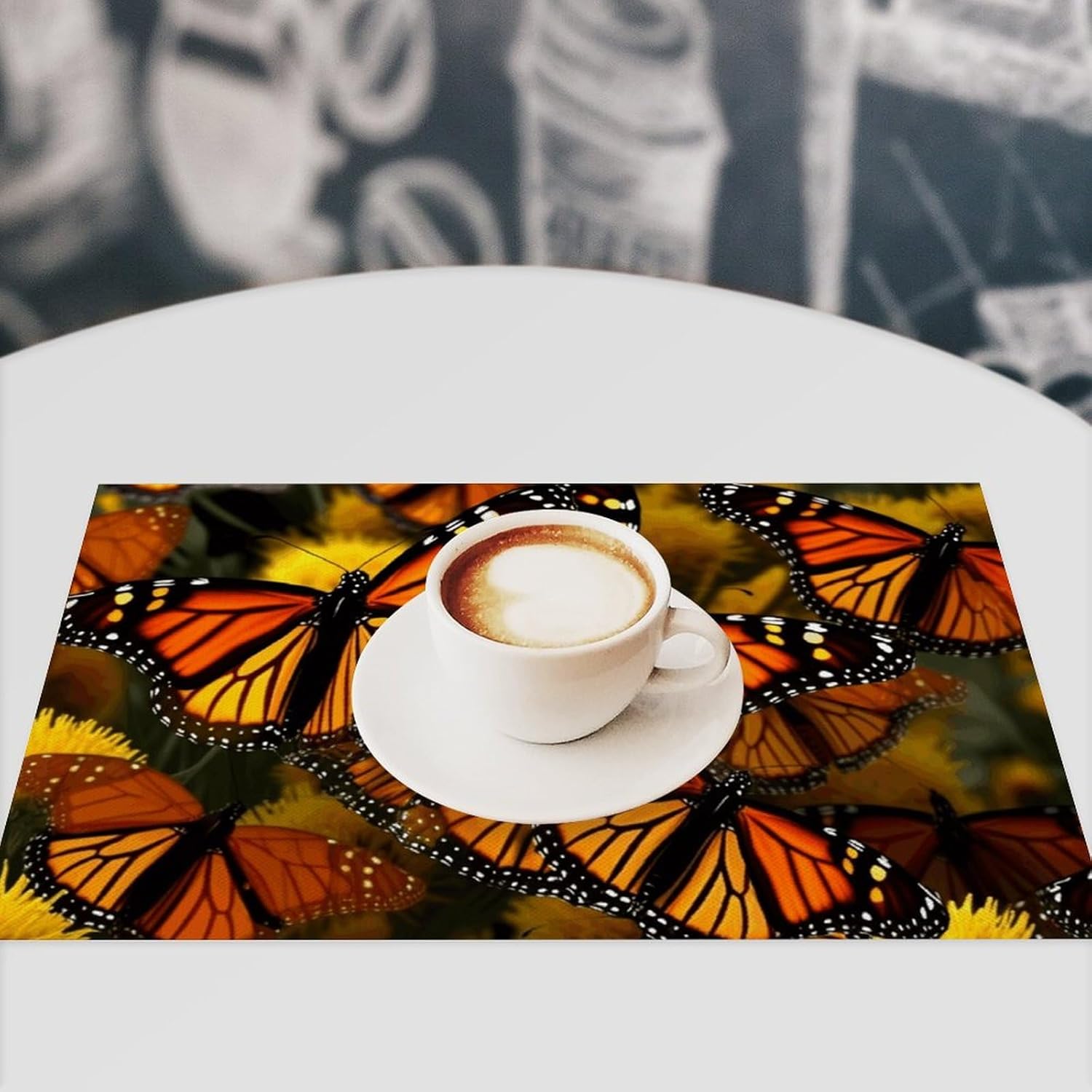 EXQUISITE MODERN PLACEMATS SET 6 PCS Place Mats Set Monarch Butterflies Vinyl Plastic Woven Place Mats for Kitchen Table Indoor/Outdoor Washable Placemat Wipeable Dining Table Mats* DURABLE: Made of high quality linen, placemats set are durable, easy to clean, non-fading, no deformation.* REINFORCED EDGE STITCHING: The hem is designed with folded border and fine stitching to ensure elegant looking and no loose threads that won't easily fray after long term use.* ANTI-SLIP & HEART-RESISTANT: While decorating your table, the modern dining table place mats also keep your desktop away from the damage of hot food and stains.* GREAT GIFT IDEA: The abstract painting placemats set of 4 will bring joy and smile to your family or friends. It can be a perfect present for any occasion: birthday, housewarming, mother's day, Christmas, and more. It’s also a good decoration to improve the quality of life for your home, restaurant, kitchen, hotel and business office.