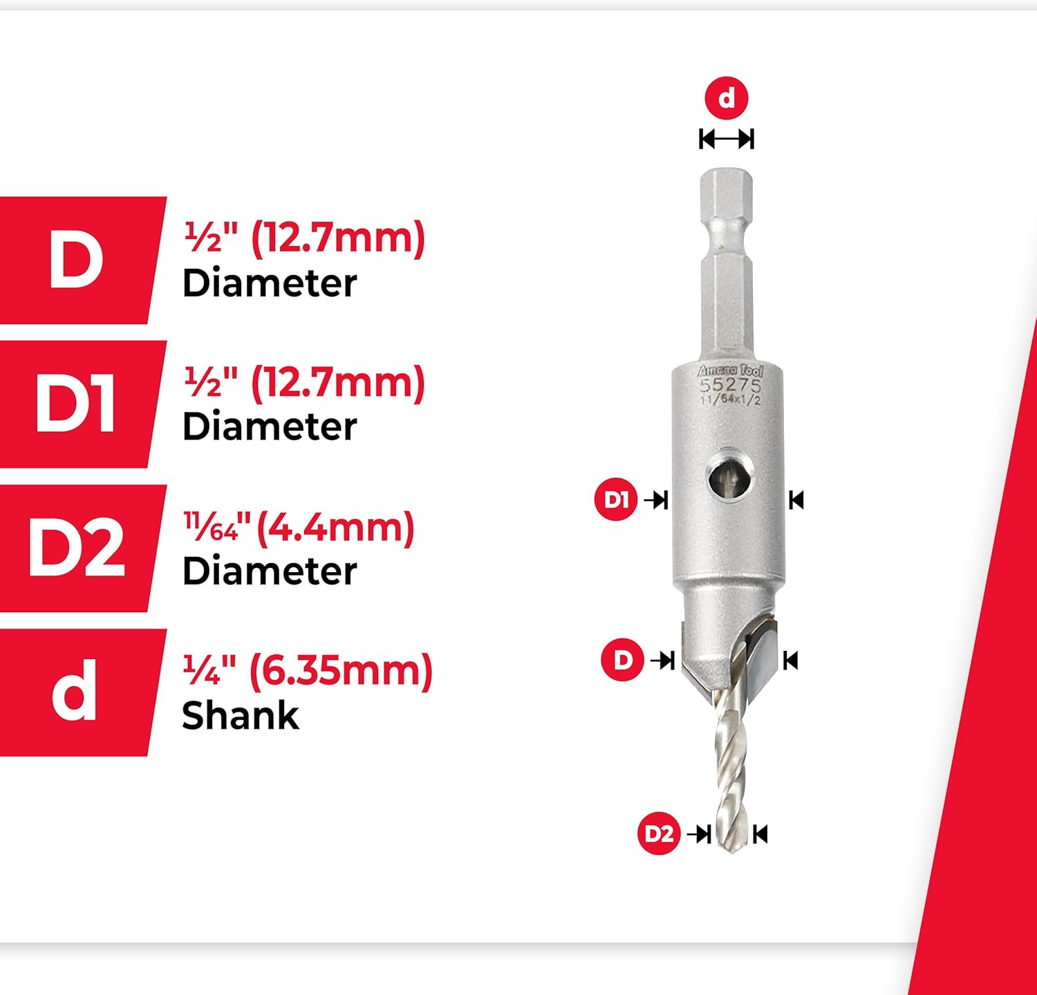 Experience precision and efficiency with the Amana Tool Countersink Bit including a slow spiral, High-Speed-Steel (HSS) M2 fully ground drill bit. This countersink drill bit for wood, plywood, plastics, and more is designed for long-lasting performance. The Amana countersink drill bit is designed to minimize chatter, reduce heat, and produce clean, precise holes in a variety of materials. Available in multiple sizes, the Carbide Tipped 82 Degree Countersink delivers dependable performance for professionals who demand precision and reliability