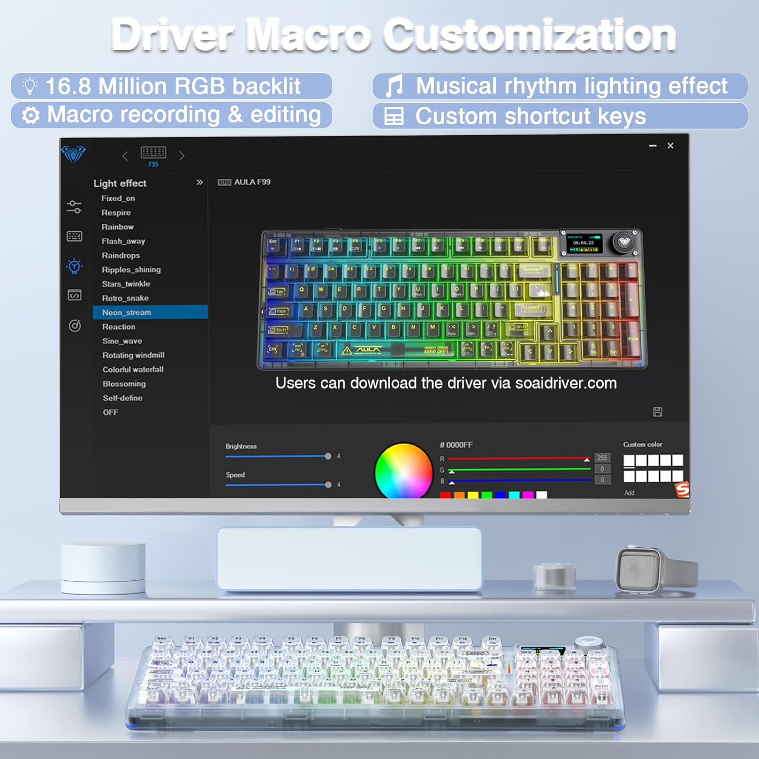 AULA F98 Pro Wireless Mechanical Gaming Keyboard with Transparent Keycaps,Hot-swappable,Pre-lubed Linear Switches,Gasket Structure,RGB LED Backlit,OLED Screen,99 Keys Triple Mode BT5.0/2.4G/USB-C Wired Macro Programmable Computer Keyboards