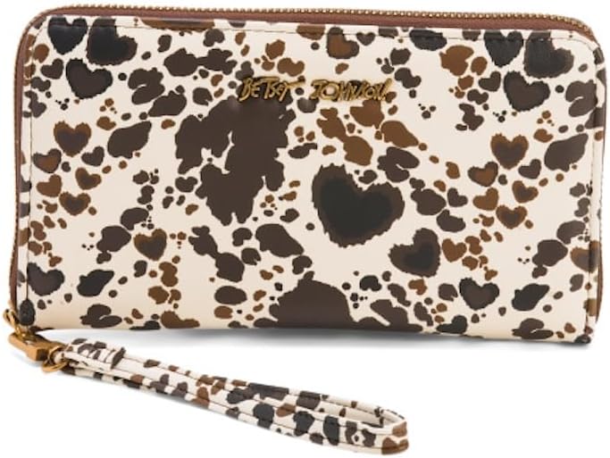 Make a bold fashion statement with this eye-catching zip-around wallet featuring a striking cowhide hearts print pattern in brown and cream. The spacious design measures 8 inches wide by 4.5 inches high, offering ample room for all your essentials. Inside, you'll find 12 card slots, a dedicated ID window, a secure zip coin pocket, and two slip pockets for bills and receipts. The faux leather construction is complemented by antique brass-tone hardware and the designer's signature logo accent. A detachable wristlet strap adds versatility, allowing you to carry it as a small clutch or secured to your wrist. The full zip-around closure ensures your belongings stay safely tucked away. This Betsey Johnson wallet combines practical organization with playful style, making it perfect for both everyday use and special occasions. The distinctive animal print pattern adds a touch of wild charm to any outfit while maintaining sophisticated functionality.