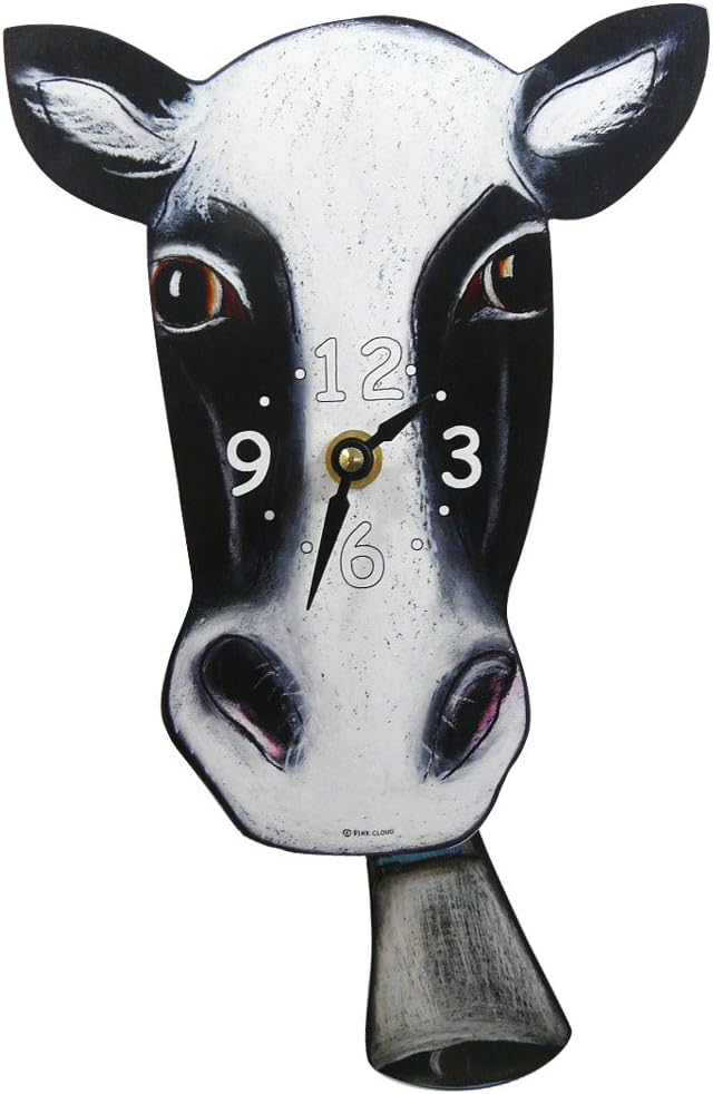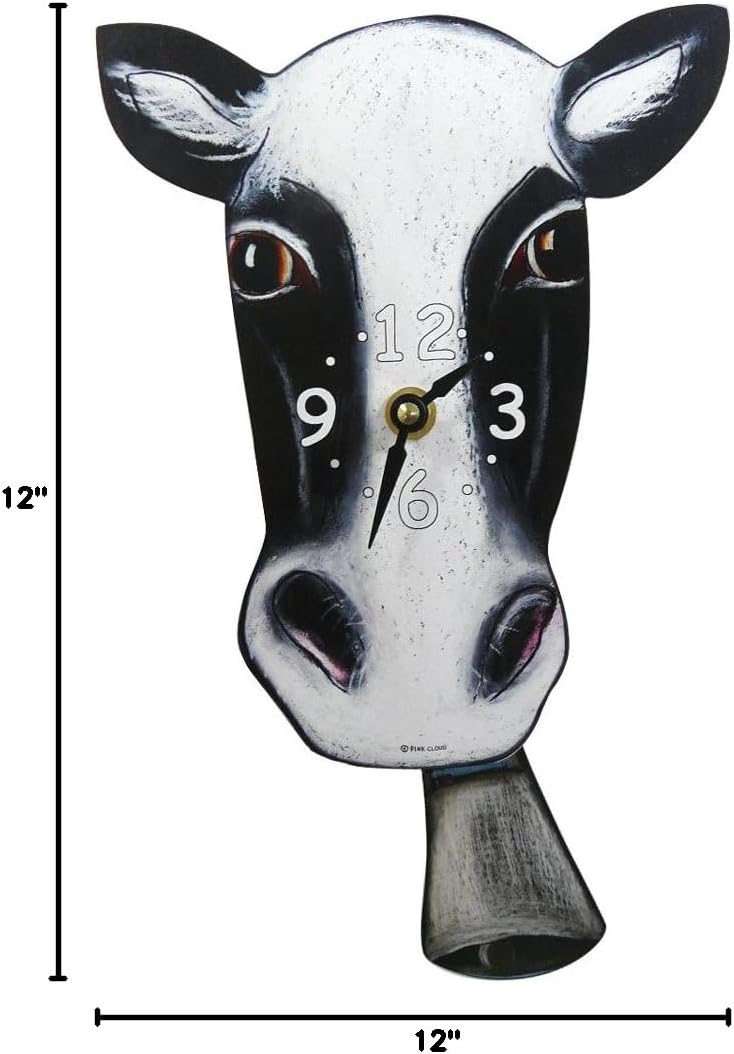 More cowbell, please! Downright lovable and cleverly designed, the cow's swinging pendulum bell always produces a smile. Made of lightweight wood, the cow wall clock measures 12-inches tall and runs on 1 AA battery (not included). Artist-designed and made in the USA.