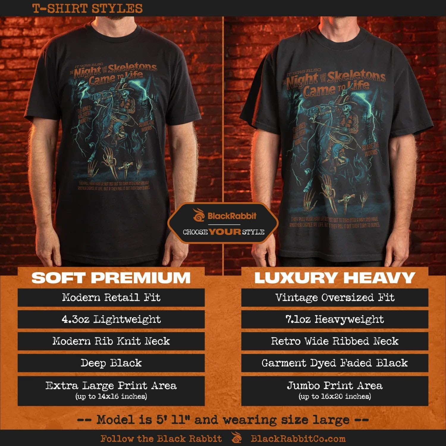 Soft Premium Tee:Next Level 3600 - Softstyle, modern retail fit4.3 oz., 100% preshrunk combed ringspun cottonXL Print - 40% wider than industry standardBlank item imported; art designed, processed, and printed by us in Louisville, KYLuxury Heavy Tee:Black Rabbit 101 - Heavyweight, oversized fit7.1 oz., Garment Dyed, 100% preshrunk combed cottonJumbo Oversized Print - 30% Larger than our standard XL PrintBlank item imported; art designed, processed, and printed by us in Louisville, KY Faded Crewneck Sweatshirt:Black Rabbit 301 - Midweight, relaxed fit9.4 oz. Preshrunk, Garment Dyed 80% cotton, 20% PolyesterXL Print - 40% wider than industry standardBlank item imported; art designed, processed, and printed by us in Louisville, KY Luxury Hoodie:Black Rabbit 401 - Midweight, oversized fit9.4 oz. Preshrunk, Garment Dyed 80% cotton, 20% PolyesterJumbo Oversized Over-Pocket Print - 30% Larger than our standard XL PrintBlank item imported; art designed, processed, and printed by us in Louisville, KY