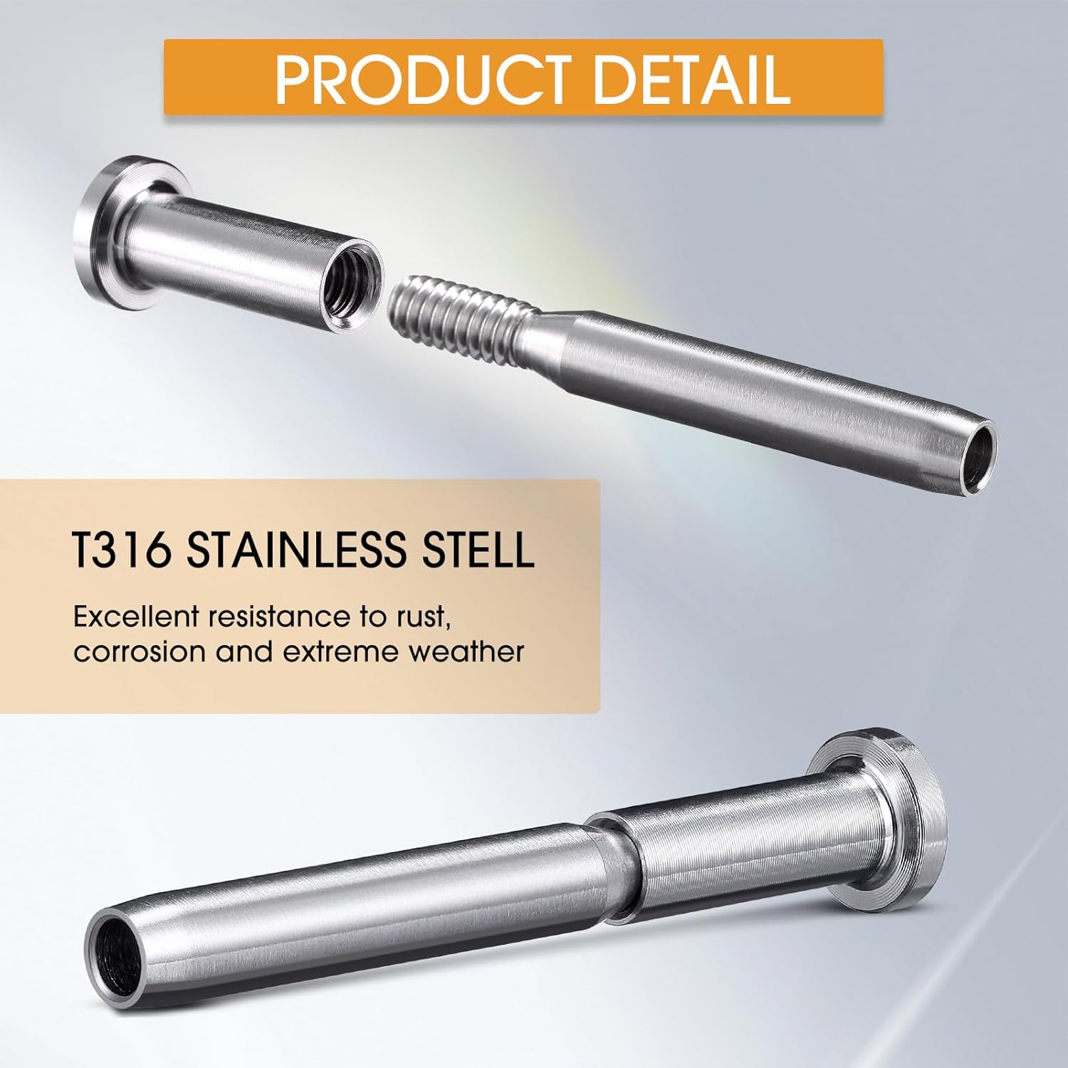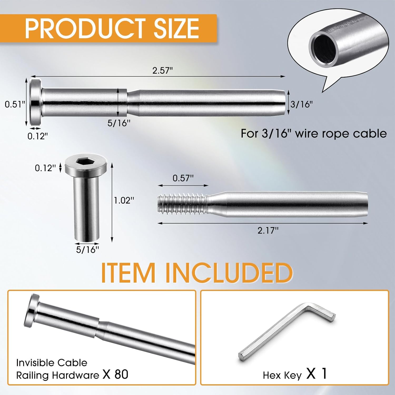 Feature: Nice Quality: Stainless steel wire balustrade hardware that is suitable for indoor and outdoor applications. Our cable railing kits have everything you need to attach one end of a cable to a post. Suitable for staircases, balconies and decking areas. This invisible turnbuckle installs in a cable railing system and looks clean and beautiful Nice Durability: Our stainless steel rigging wire and fittings are marine grade 316, it is corrosion-resistant which makes our balustrade hardware suitable for coastal installations. Invisible Receiver and Swage Stud End for Cable Railing. These are quality parts, you will have a great job. Basic information: Quantity: 80 Material: STAINLESS STELL Color: silver Fits: 3/16 inch cable railing Package include: 80 x 3/16” Stainless Steel Invisible Receiver Swage 1 x wrench. Notes: Manual measurement, there may be slight differences in size. Due to the screen display, the color of the item may differ slightly from the picture.