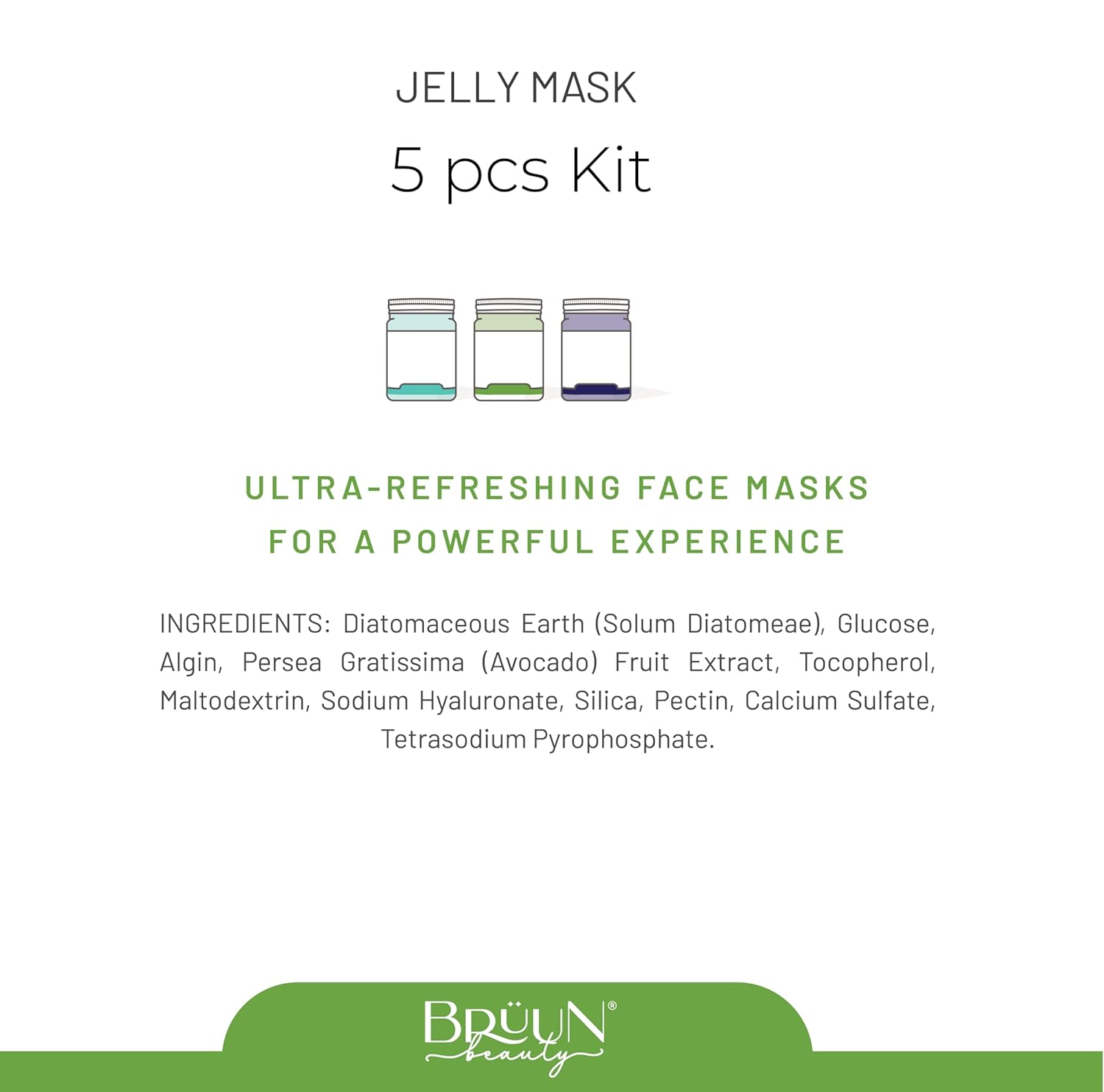 BRUUN Provides complete SPA set bundle at affordable price. These facial masks are made with premiums quality ingredients which are very beneficial for all skins. This bundle contains 5 different treatment jars 24k Gold, Egyptian Rose, Pomegranate, Aloe Vera and Hyaluronic which helps in hydrating of skin. Our Jelly Mask Jar has its own specific Functions and benefits which Comes with 33% extra powder. How to use: Remove makeup and thoroughly clean face and neck Preparation of the gel face mask a) In a bowl, put the mask powder and water. Use the 4:3 Ratio b) Mix gently with a spatula until the powder of the mask becomes gooey. Apply the rubber mask on your whole face with spatula. Wait for 20 minutes and after this remove your mask gently. Masks are not reusable.