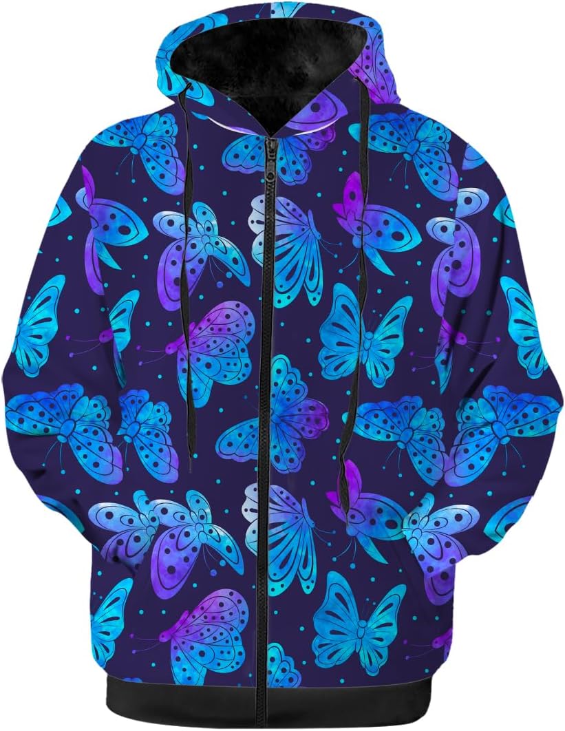 Womens warm winter jacket coat fleece zip-up hoodie sweatshirt-built for warmth,style and Comfort.Designed for winter with warm inner layer to lock in heat,keeping you toasty during walks,ski trips,weekend hikes,family gatherings,or travels.Womens winter jacket features a full-zip closure for easy wear.Side pockets conveniently store phone,keys,or gloves.The adjustable hood drawstring provides wind protection and neck warmth.Machine-washable for easy care.Butterfly jacket with soft,warm fabric provides all-day comfort.Featuring 3D print graphic offers a trendy touch to winter fashion.Unisex winter jackets make funny gifts for women,men,mom,dad,friends,couplesThis zip-up jacket suitable for leisure,work,and sports.Pairs easily with jeans,sweatpants,leggings,or casual trousers for fashionable daily looksUS sizes XS-5XL fit standard and plus sizes.Choose size for comfortable fit.Size up for loose.