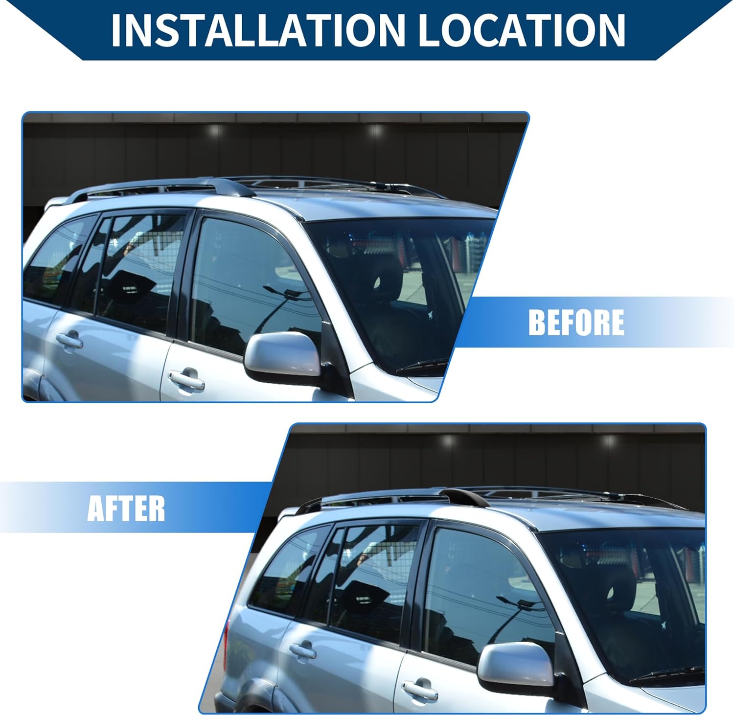 VEHICLE COMPATIBILTIY:for Toyota RAV4 2001-2005PERFORMANCE:The new beautiful roof rack cover shell design provides a stylish look to the car and upgrades the look of your car.It is made of ABS plastic, colorfast, durable, and long service life.It is removable and you can remove it when you don't need it or you want to change another.Directly replace the old or damaged top luggage rack end cover, no drilling is required, not easy to fall off.PRODUCT INFORMATION:Product Color: BlackProduct Material: ABS PlasticProduct Size 1: 21x7.5x5cm / 8.27"x2.95"x1.97"(L*W*H)Product Size 2: 27x7x4cm / 10.63"x2.76"x1.57"(L*W*H)DIRECT INSTALL:Easy to install, just install the rack cover caps directly on both ends of the cargo racks and finish.This is non-OEM product, accessory ONLY!PACKAGE LIST: Package includes 4 Pcs Car Roof Rack Side Rails End Cover Shell Cap