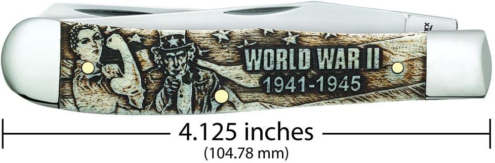 6254 SS pattern. 4.13" closed. Mirror finish stainless clip and spey blades. Natural bone handle. Nickel silver bolster(s). War Series. Embellished WWII handle artwork. Boxed.