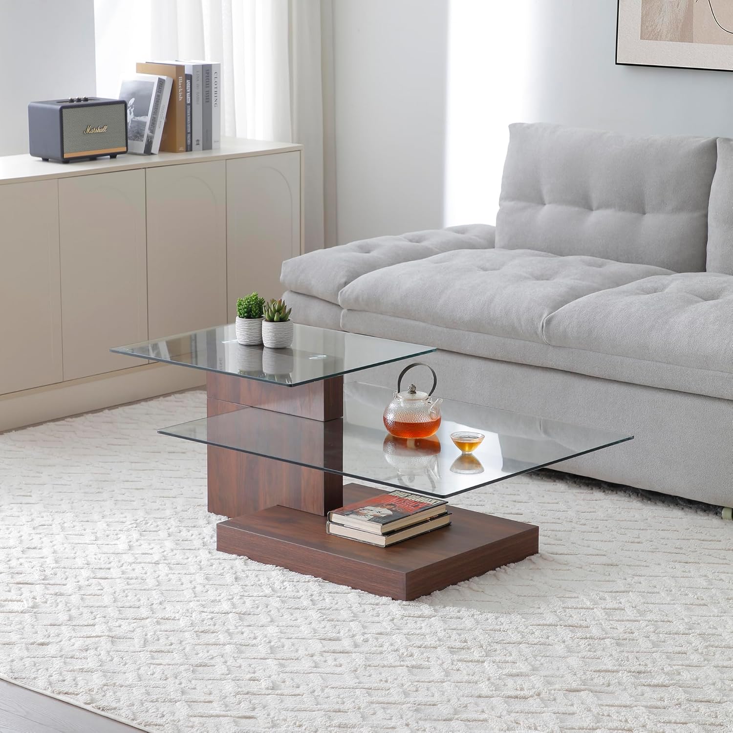 Enhance your living space with this modern coffee table, thoughtfully crafted with two layers of tempered glass and a sturdy wooden base. The top and lower shelves use high-strength tempered glass that provides excellent clarity and durability, lending an open, airy feel to your room. The wooden base offers reliable support and stability, striking the perfect balance between modern minimalism and cozy warmth With its dual-tier design, this table provides ample room for both storage and display, keeping your essentials like magazines, remote controls, and tea sets neatly organized, while the upper surface is ideal for showing off decorative accents. The tempered glass is not only stylish but also easy to clean—simply wipe it down to maintain its shine. Whether you’re looking to complement a contemporary sofa or make a statement in a classic setting, this versatile coffee table elevates any interior with its refined aesthetics and practical functionality.