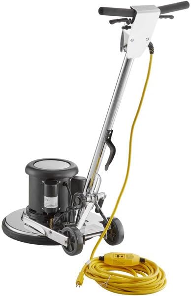 Transform your floor maintenance routine with this powerful 17" Lavex rotary floor machine. Operating at 175 RPM, this versatile single-speed unit excels at scrubbing, spray buffing, stripping, shampooing, and bonnet cleaning. The durable stainless steel construction adds weight for enhanced cleaning performance while maintaining operator comfort. Features include an adjustable handle extending up to 45", non-marking wheels for easy transport, and a generous 45' power cord for extensive coverage. This commercial-grade machine comes complete with multiple attachments - a pad driver for hard floor maintenance, a dedicated carpet brush for deep cleaning, and a floor scrubbing brush for thorough surface cleaning. Powered by a robust 1.5 HP motor with triple planetary gearbox, this floor machine delivers consistent, professional results across healthcare facilities, airports, retail spaces, and other commercial environments. The built-in GFCI plug provides added protection against power issues.