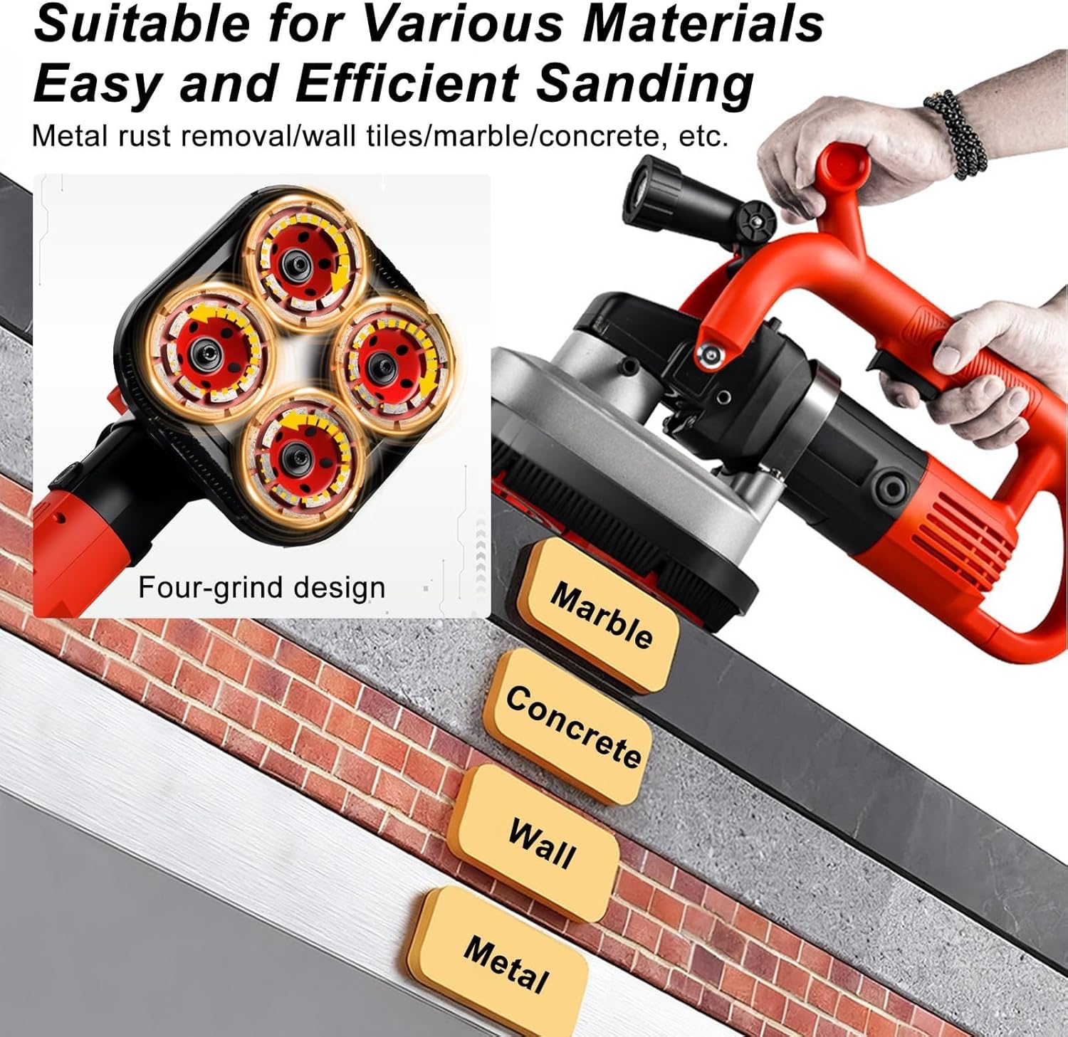 Upgrade your professional surface treatment with this powerful electric diamond grinding and polishing machine. Designed with a robust 3600W motor and a 4 diamond wheel configuration, this floor grinder delivers excellent coverage and control, making it ideal for construction sites, remodeling, flooring contractors, and workshop maintenance. Features:1. Upgraded Grinding Efficiency: This electric diamond concrete grinder features a 4-head structure, significantly boosting grinding efficiency.2. Adjustable Speed: Equipped with a 6-gear speed control ranging from 600-3000rpm, allowing for easy adjustments to meet different grinding requirements.3. Powerful 3600W Motor: Powered by a pure copper motor, this concrete floor grinder provides robust power and heat resistance, enabling precise and efficient grinding and polishing for a professional surface finish.4. 90° Grinding Angle: Features a detachable top dust hood, allowing for 90° grinding at wall edges, perfect for reaching narrow corners and ensuring no areas are left untouched.Specifications:Color: Red, BlackMaterial: Aluminum Alloy, PlasticMotor Type: Brushed Pure Copper MotorPower Source: Corded ElectricSpeed Gears: 6Voltage: 110V, 220V-240VPower: 3600WSpeed: 600-3000r/minPackage Size: 55.5*37.5*22.5cm/21.85*14.76*8.86inNet Weight: 9.5kgPackage Included:1x Handheld Electric Polishing Machine4x Polishing Discs4x Sandpapers4x Adhesive Discs4x Diamond Discs (Already Installed)1x ManualOther Accessories for Assembly