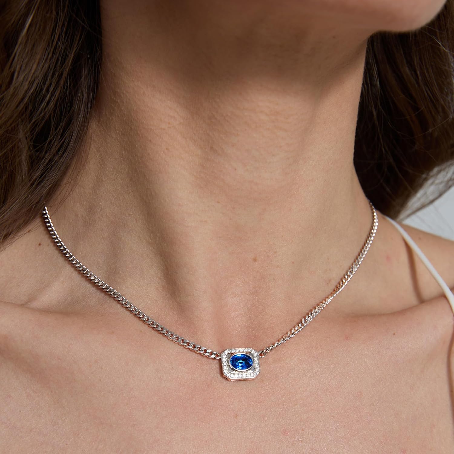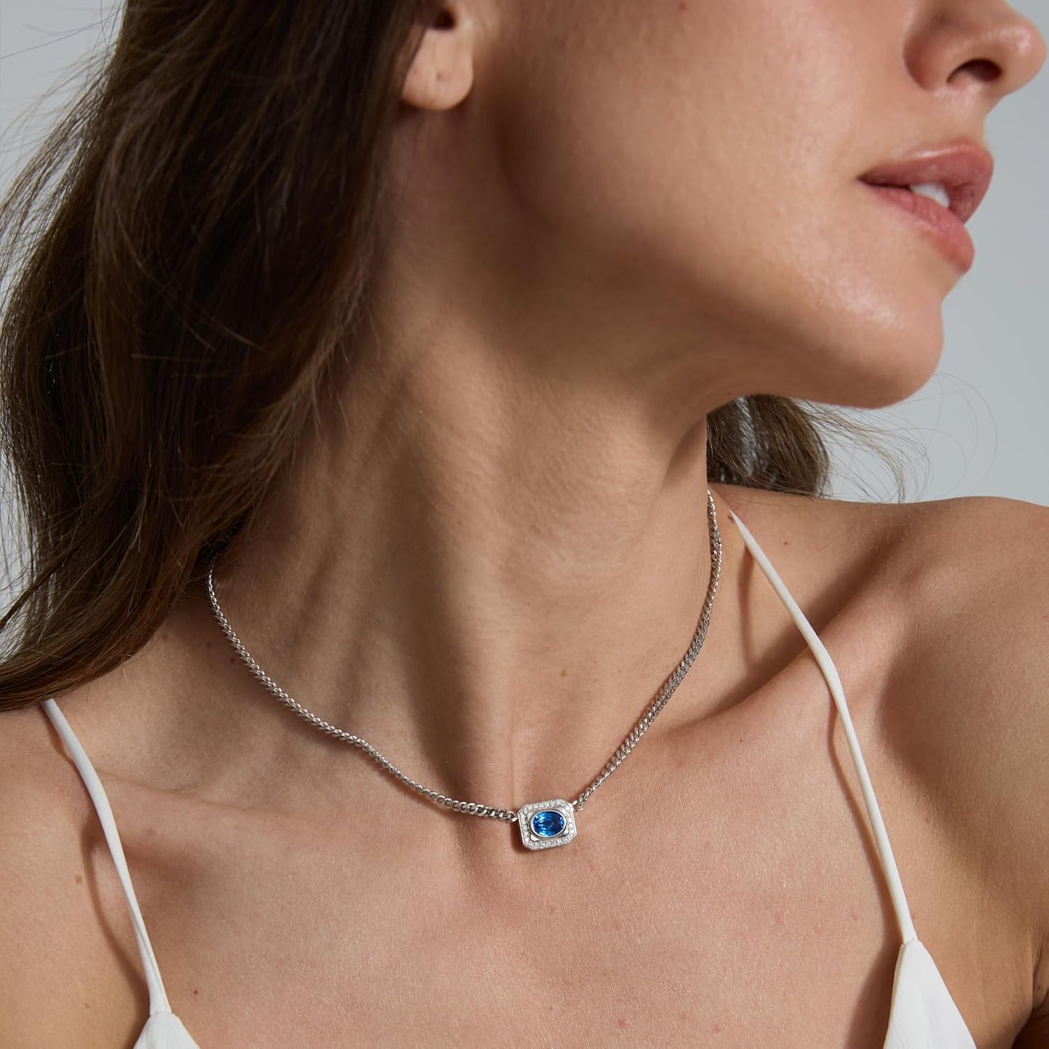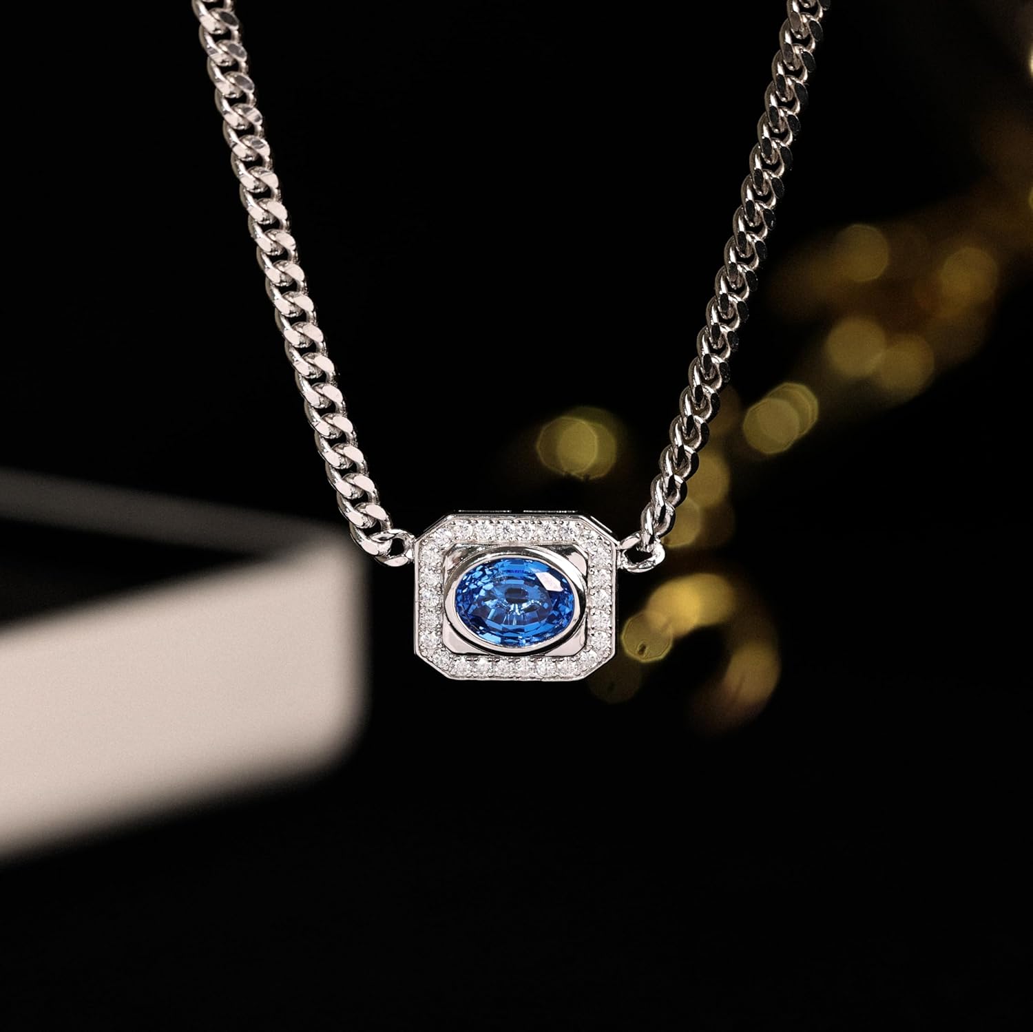 This sterling silver cuban chain necklace for women features a lab-grown cobalt blue spinel accented with sparkling moissanites in a halo design. Crafted in 18K white gold plated 925 sterling silver, this cuban link pendant necklace is durable, tarnish-resistant, and designed for lasting shine. The vivid blue lab-grown spinel gemstone offers brilliance and clarity, while precision-cut moissanites add diamond-like fire. Certified for authenticity and quality, this elegant gemstone necklace combines modern craftsmanship with timeless style, making it a versatile choice among gemstone necklaces for women. Each piece comes in a premium jewelry box, ready as a thoughtful jewelry gift for her. Perfect for any occasion, this necklace is ideal as a birthday gift necklace, anniversary gift necklace, or elegant cuban chain pendant. Add this statement piece to your collection of women’s jewelry and enjoy the beauty of a radiant gemstone that captures attention every time you wear it.