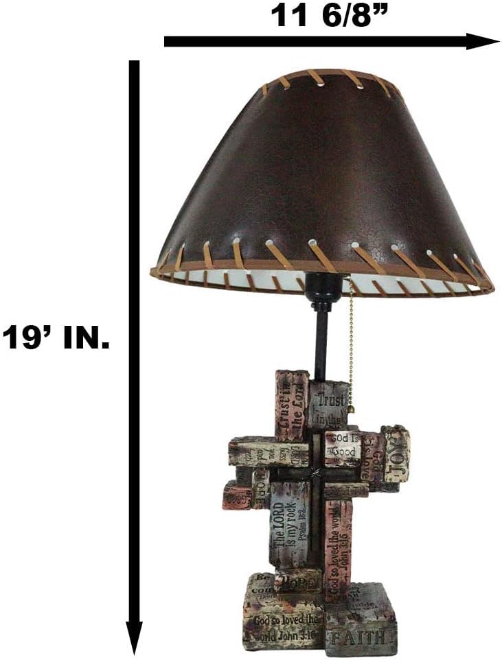 Brighten your space in Vintage and Inspirational style with this 19" table accent lamp carved in a Cross pattern. The cross is made up of building blocks of scriptural verses/quotes and inspirational Christian words such us Faith Hope Love. Done in multi colors the cross base is topped with a brown faux leather look laced paper shade. The lamp is stunning and will brighten your hearts as well as space all at the same time!