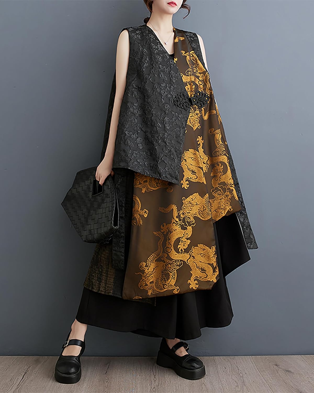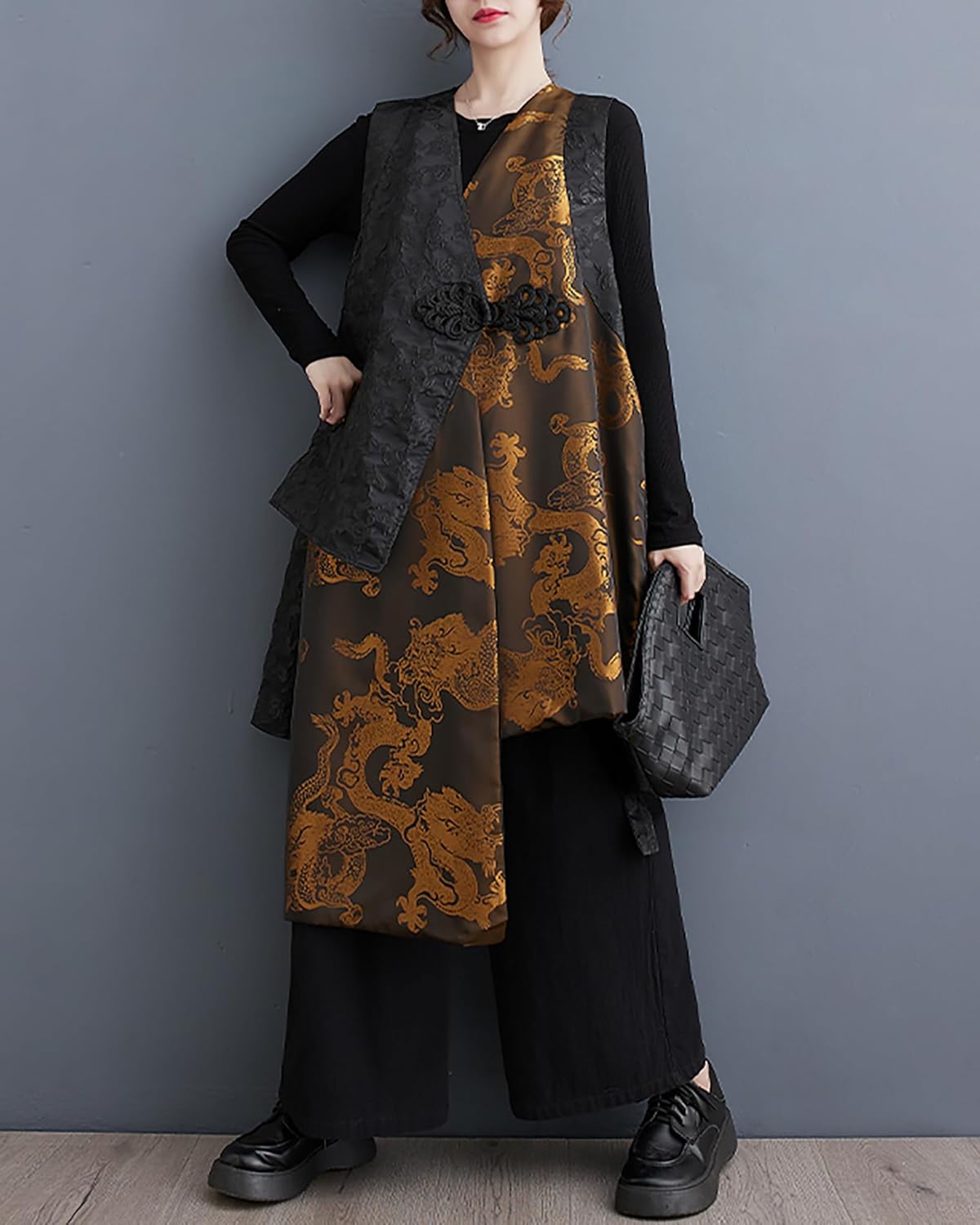 Onesize: Length 35-42.5 in/ Bust 59 in (fits Small-X-Large) Fit Occasions: Women's Designer Coat suitable for Any Occasions, Such As Party, Club, Cocktail, Shopping, Wedding, Work, Vacation, Beach, Daily Wear, Wedding Guest, Dating, Maternity or Semi-formal Wears Features: This coat has an oversized, loose fit with a sleeveless V-neck design. The black color and golden dragon pattern add a stylish and unique touch Material: 75% Cotton + 25% Polyester, sweat absorption, breathable, more comfortable and soft to wear. Lightweight, comfy and soft skin-friendly fabric. High-quality material, breathable to wear Season: Sleeveless, loose and casual style, suitable for wearing in Spring and Fall