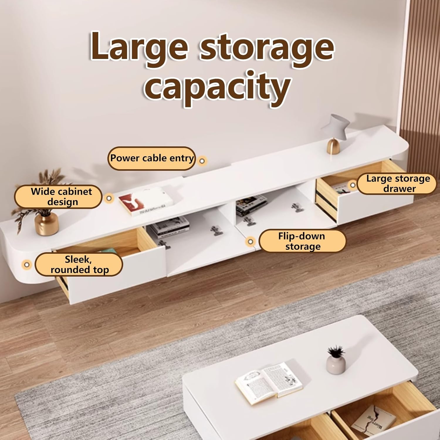 Modern Floating TV Stand with 2 Large Storage Drawers | Solid Wood Wall Mounted Media Console | Includes Installation Accessories for Living Room & OfficeProduct Name:Wooden Wall-Mounted TV Console/Floating TV Stand/Entertainment Center Media Console, Material: wood.Color: as shown.Style: simple and modern.Scope of application: living room, office, bedroom, etc.Floating TV Stand, Wall Mounted Media Console with Large Storage Drawers | Solid Wood Entertainment Center TV Cabinet with Mounting Hardware | for Living Room Office【Please note the tips】 About the sales list-------This shop only sells floating TV console, other pictures are not included. About the color: Due to different cameras, lighting conditions and monitor settings, the actual color may differ from the picture. Please refer to the actual product, but this is not a quality problem. Regarding the size---------Please allow a slight deviation in the measurement data. There may be a deviation of 1 ~ 3 cm, please refer to the actual product.