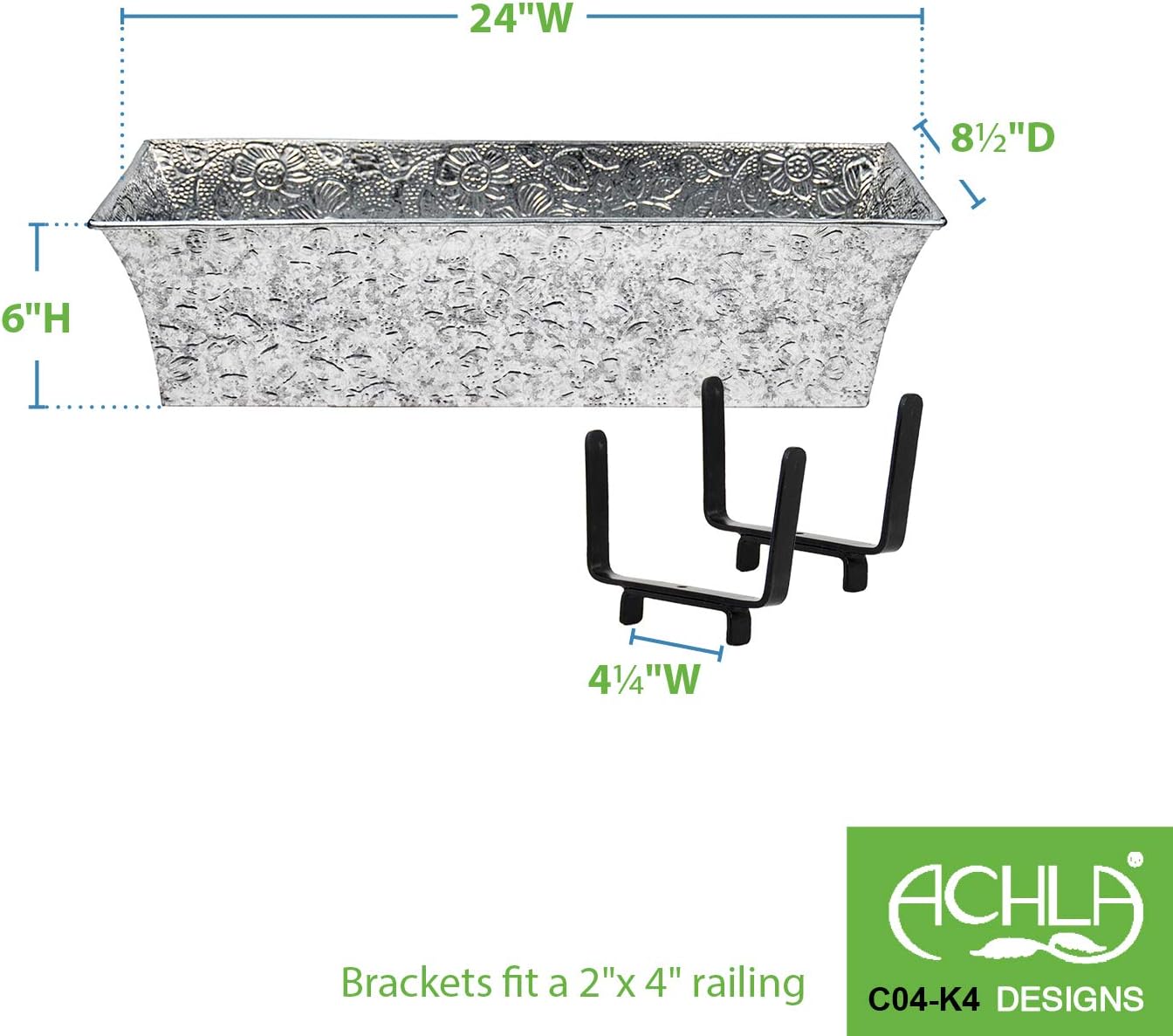 These brackets are designed to securely hold flower boxes to the top of a deck or porch railing. Fasten the brackets down to the rail at your preferred distance apart and boxes are captured within the U-shaped holder. In two widths to fit standard 4 and 6 inch railings. Use with Embossed Flower Box (C-04) or Small Galvanized (C-08) or Small Copper Plated (C-08C) Flower Box.