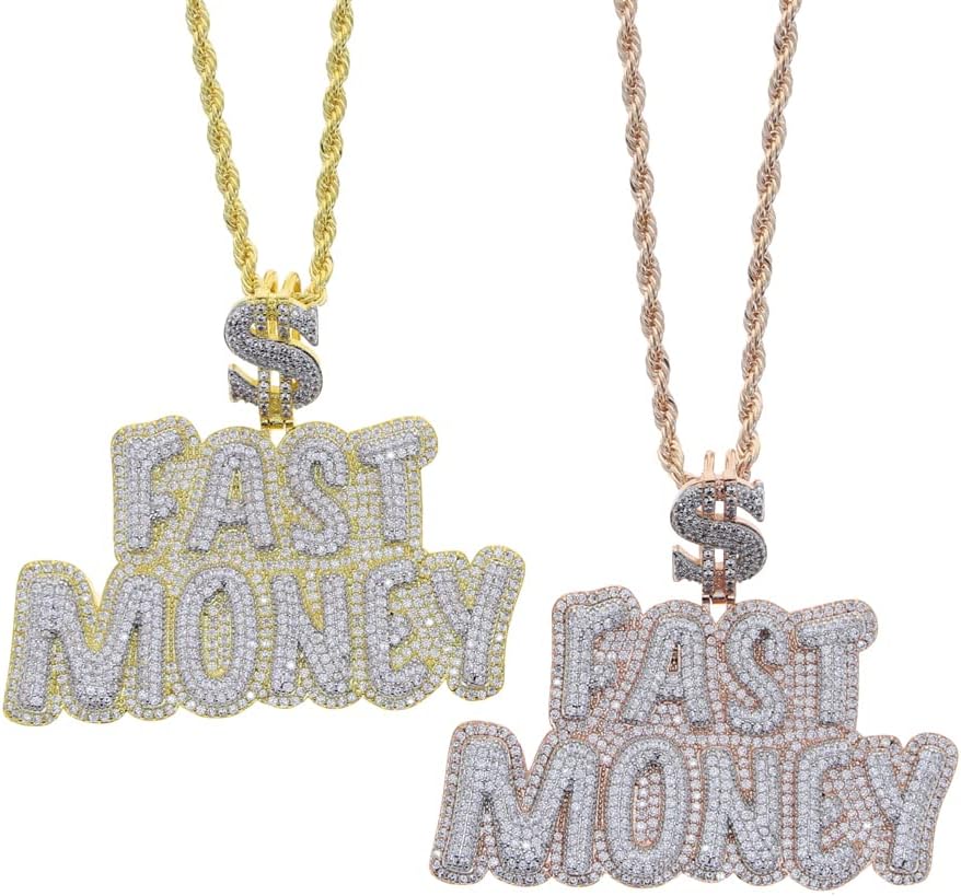 Iced Out Big $ Letters FAST MONEY Pendant Necklace for Men Women
