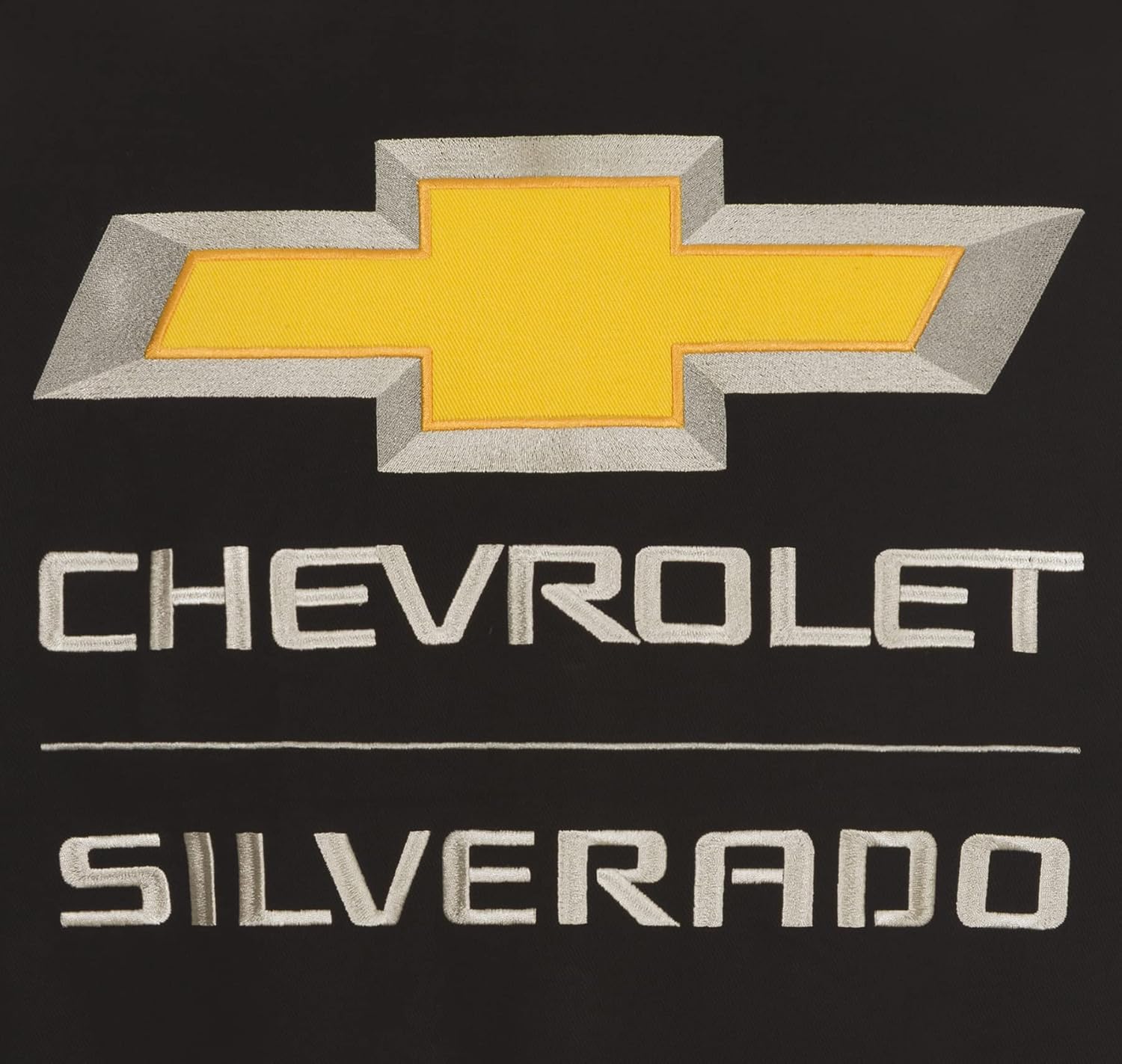 Men's Chevy Silverado truck jacket features a racing style design with embroidered and material filled Silverado emblems on the front, back, shoulders and sleeves. This jacket features a snap-up front, 2 front hand pockets, 2 inside chest pockets, satin lining throughout and stretch knit cuffs and waistband. You've already got the nicest truck on the market now check out the nicest Silverado apparel from JH Design. When you open that little brown box from Amazon you're going to find the coolest Silverado gift money can buy. When you put on this Silverado jacket you'll feel how comfortable the jacket is and want to go for a ride. Now imagine getting out of your Silverado and everyone admiring your ride then seeing your brand new Silverado truck jacket that all true Silverado fans wear. High quality brushed cotton twill design. Professional Cleaning Only! Avoid getting wet. Body: 100% Cotton. Lining and Trim: 100% Polyester.
