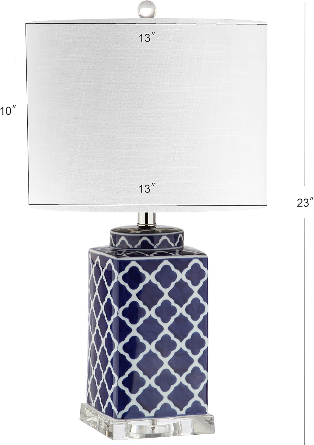 Nothing combines classic and bold like the trellis pattern, which makes it a perfect fit for the equally-versatile square ginger jar shape. A crisp linen drum shade with rolled edges tops the look. Finished with a Lucite finial and silk-wrapped cord.