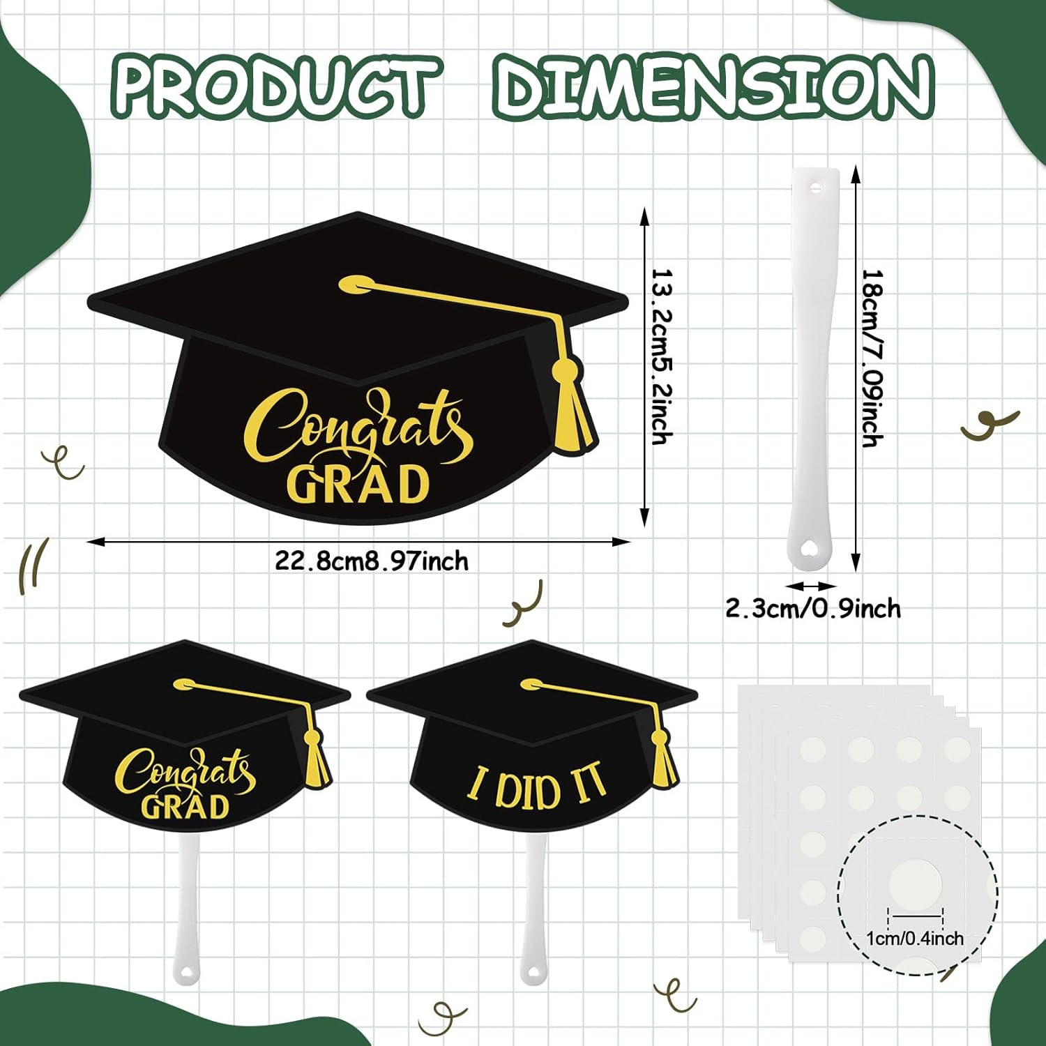 | Included Components | 10 Sheets glue points, 24 Pieces [Congrats GRAD] grad cap fan, 24 Pieces [I DID IT] grad cap fan, 48 x Plastic sticks |