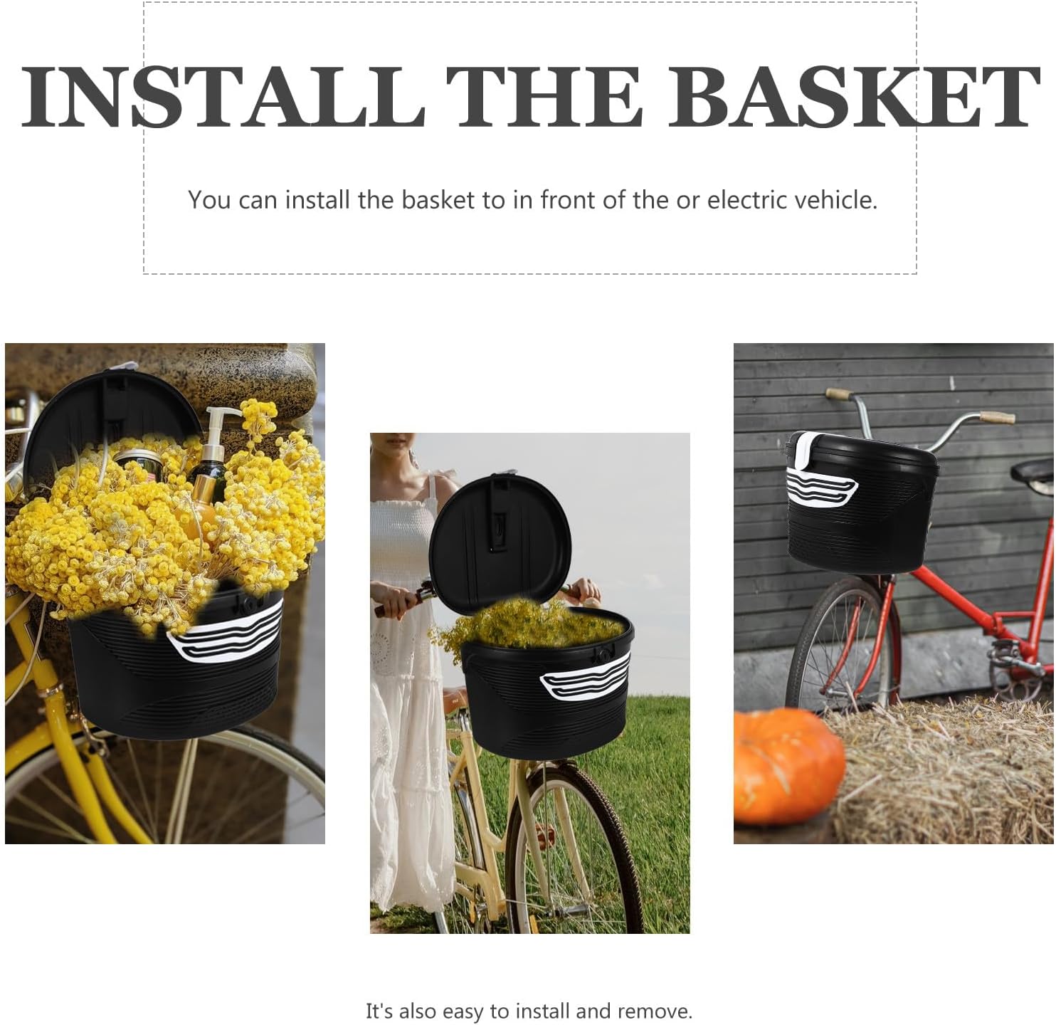 Package Include 1 x Basket 1 x Lock with Key Characteristics -Material: Plastic, Resin -Product Info:Electric car basket -Size: About 26.00X23.00X20.00cm/10.22X9.04X7.86in -Strong load-bearing capacity, and the thickened material is more durable. -Waterproof material, it is lockable, which can make sure of your private items . -Made of of durable and use, delicate design. -Stable and not easy to break or fall down from the bike. Fit for most bikes, easily attach within the bikes bike cargo rack basket. -Simple installation and disassembly, and it will not fall down easily bicycle front basket.Goods Descriptionbicycle front rack You can install the basket to in front of the or electric vehicle.bike accessories It's lockable, which make it convenient for you to check out if the items inside is missing.small bike basket This simple, stylish basket is suitable for your or electric vehicle.bike block mount bracket It's also easy to install and remove