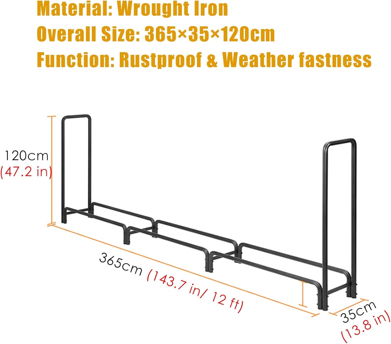 Perfect size firewood storage rack to fit on outdoor back porch, back yard deck, outside backyard fire pits, under eaves, on patios, tool shed, wood shed, chaotic pile inside the cabin, indoor garage, family room, covered patio to hold enough wood for fireplace all seasons. Benefits: - Heavy duty, Rustproof Weather fastness. - Keep the firewood neatly stacked and dry and make it more efficient and ready to burn. Specifications: - Material: Wrought Iron - Size: 365×35×120cm/ 143.7×13.8×47.2 in - Color: Black - Packing Include: 1× Firewood Log Rack Installation Steps: - 1: Stand the high tube vertical to the ground. - 2: Stand the long tube short end vertical to the ground. Make sure the holes on two tubes in the same line. - 3: Put the steel bar between the two tubes. Make sure the hole of the steel bar is the same line with the first hole of the tubes. - 4: Put through the screws to holes directly from the right end and strengthen the screws with tongs. - Note: There are two washers between the bottom horizontal tube and vertical uprights on the bolt ends. Tips: * Before purchasing, please measure carefully the size you need. * As the firewood racks is handmade, the size may vary slightly (within 1-2cm). * Colors shown in pictures may slightly differ from actual product due to lighting and color settings.