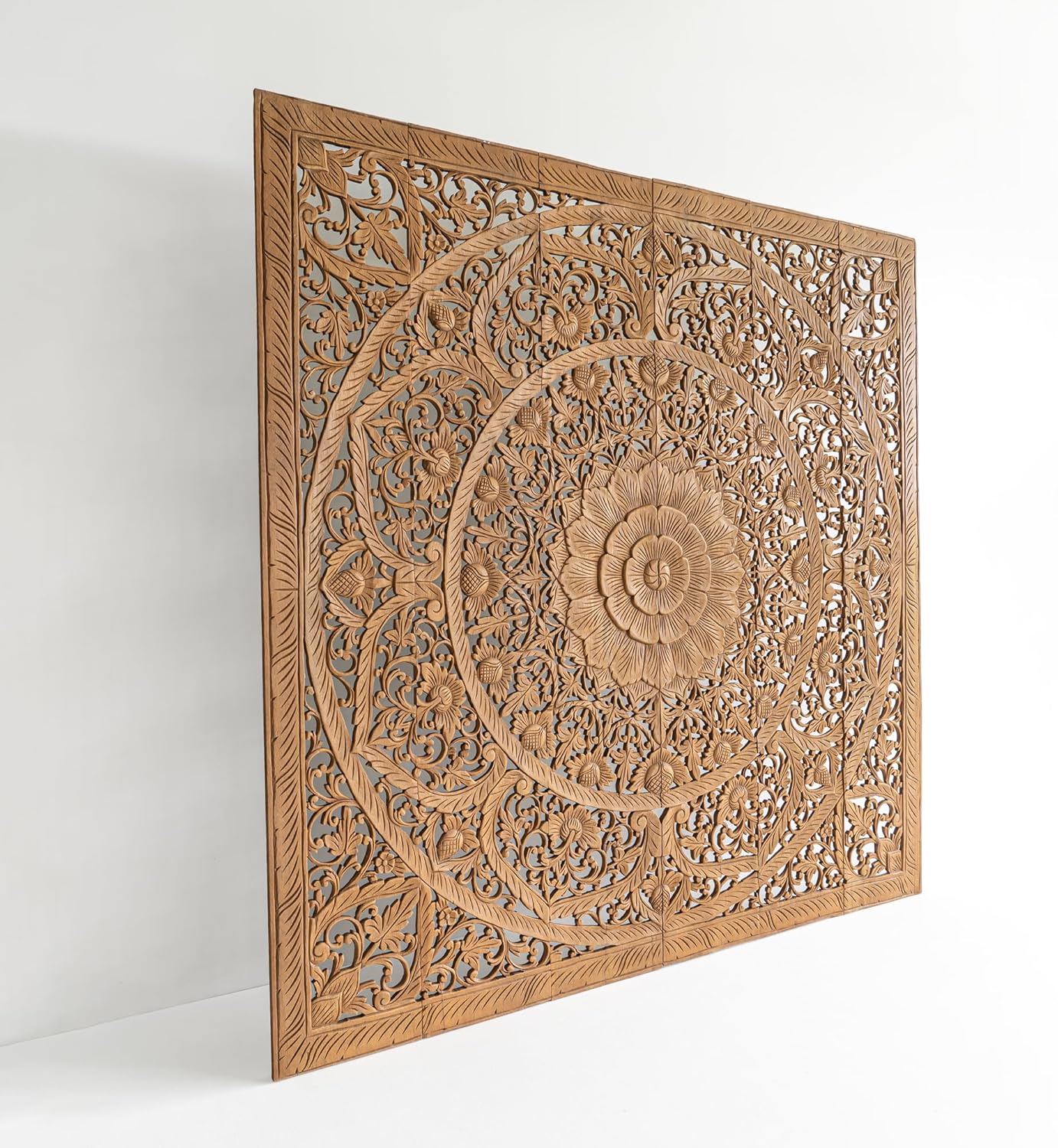 Beautiful Mandala wood carve mounted bed headboard. Unique wall art hanging furniture handmade in Thailand.
