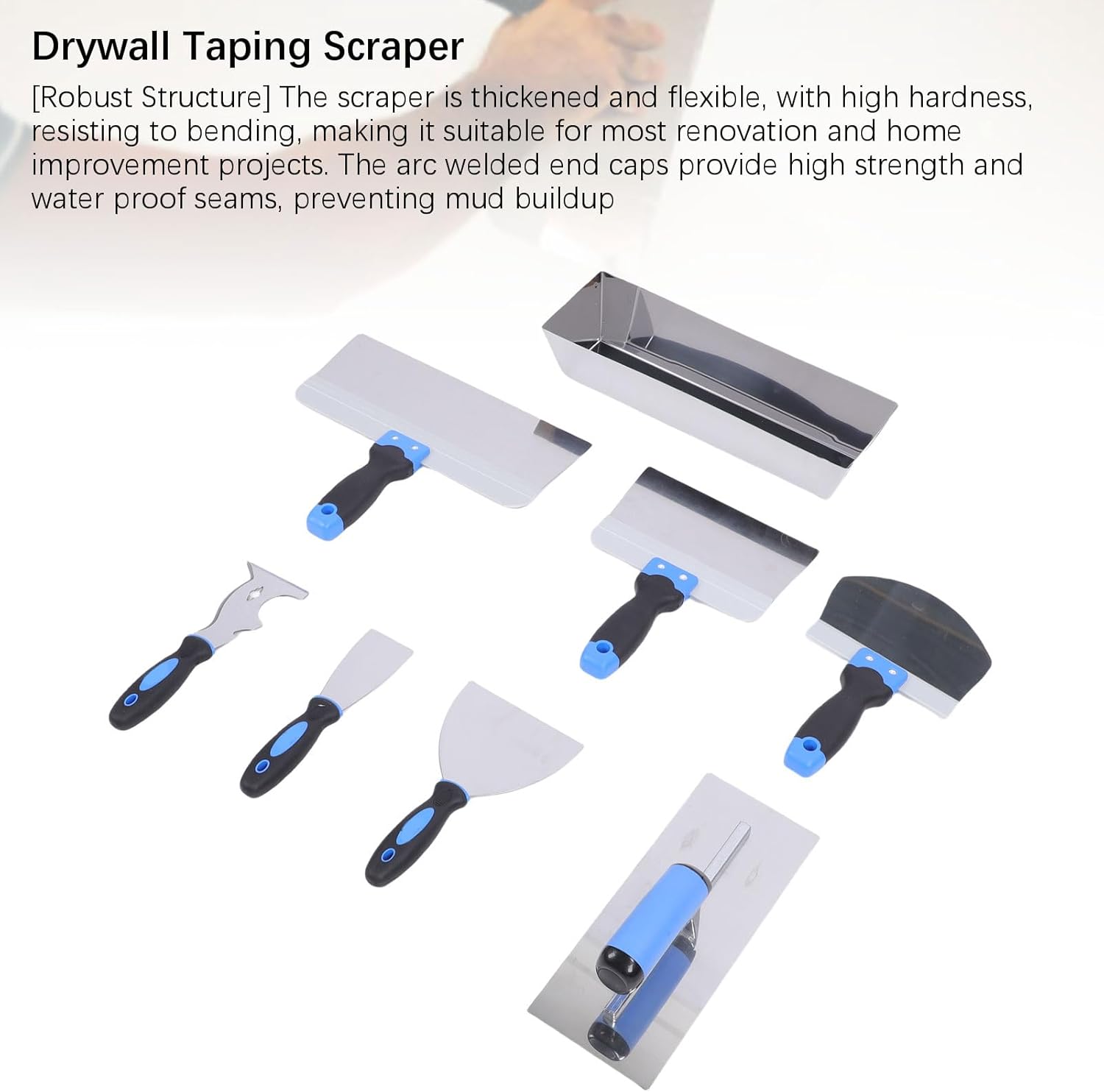 Durable Stainless Steel Construction: These drywall scrapers are made from stainless steel with mirror polishing, offering rustproof protection and easy cleaning. The precisely ground edges ensure long lasting performance. Comfortable Soft Grip Handle: The handle uses PP and TPR materials with non slip texture on both sides and front/back finger guides for a comfortable grip that facilitates efficient work on large areas, plus a hanging hole for storage. Robust and Flexible Design: The scraper is thickened and flexible with high hardness, resisting bending for renovation projects. Arc welded end caps provide high strength and water proof seams to prevent mud buildup. User Friendly with Reinforced Build: The plastering tool is strengthened with triple rivets for added durability. The curved trowel design allows easier side scraping without dead spots, and its lightweight build reduces fatigue during manual work. Versatile Wall Treatment Applications: This scraper kit is suitable for applying drywall joint tape, finishing, patching, polishing, wallpaper hanging, corner repair, paint removal, and filling cracks, making it essential for builders, carpenters, and technicians. Specification: Item Type: Drywall Spatula Set Product Material: Stainless Steel, PP, TPR Specifications: 3 Inch, 2 Inch, 5 Inch, 6.5 Inch, 8 Inch, 12 Inch Plastering Trowel Size: Approx. 280 x 115mm / 11 x 4.5in Mud Pan Size: Approx. 360 x 120 x 75mm / 14.2 x 4.7 x 3in PackageList: 1 x Multifunctional Scraper 1 x 2 Inch Putty Scraper 1 x 5 Inch Putty Scraper 1 x 6.5 Inch Arc Scraper 1 x 8 Inch Taping Spatula 1 x 12 Inch Taping Spatula 1 x Plastering Trowel 1 x 14 Inch Mud Pan Note: Size may have errors.