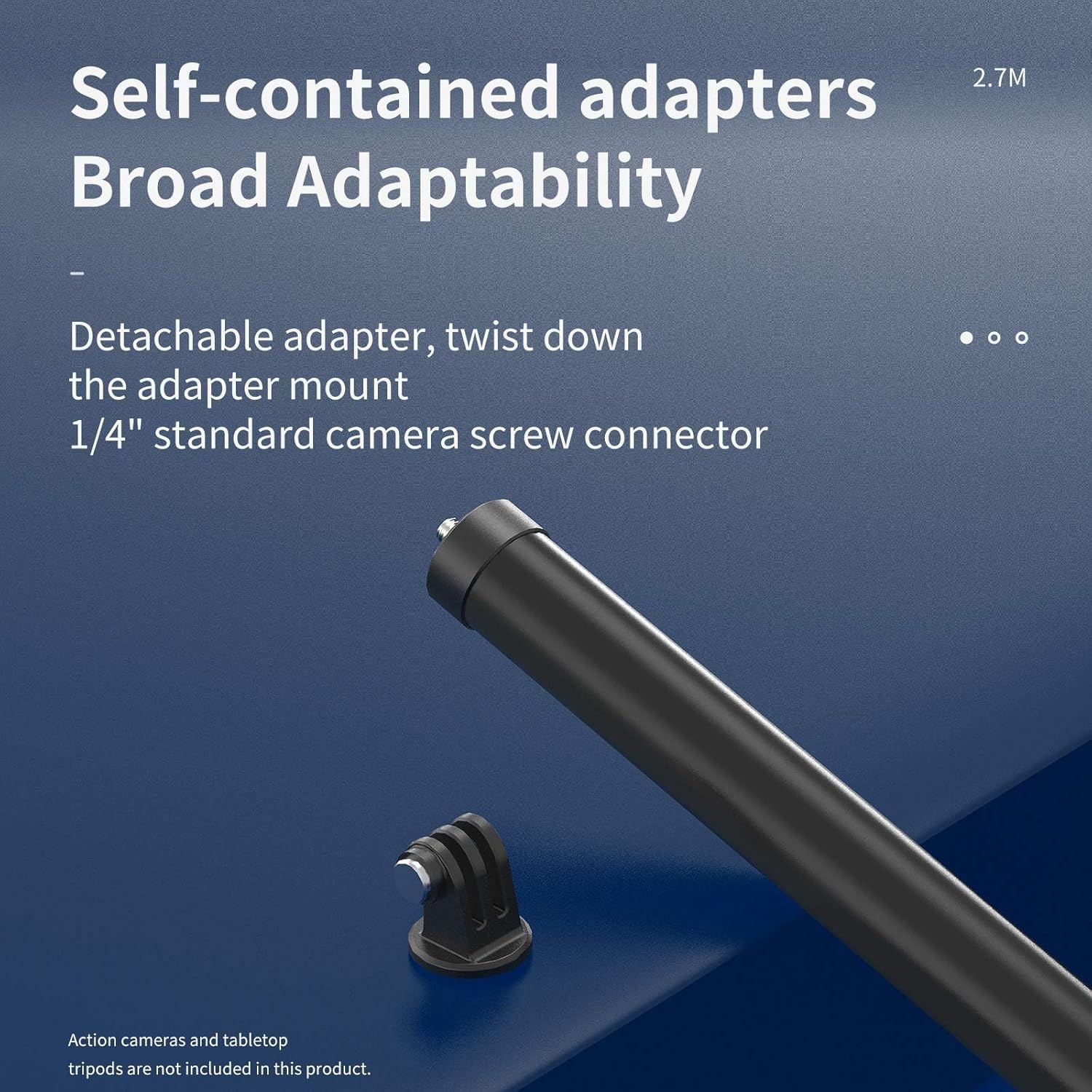 Extendable at more than 6 Lengths 40cm/15.75", 95cm/37.4", 125cm/49.2", 180cm/70.86", 205cm/80.7", and the longest 270cm/106"! Made in Upgraded Carbon Fiber Material which makes it as lightweight as possible at 260g/0.57lbs, very easy to carry out for traveling!Currently the most innovative design for selfie pole in the market!Features1. Easy to use for different distance shooting, getting amazing shoot both for selfie and group photos2. The end of the stick has a standard 1/4 tripod adapter (female) which can be mounted with a strong tripod stand3. At top of the stick has a 1/4”bolt and a mount for gopro which can be removed to fit with other cameras that has standard 1/4” adapterCompatible with: GoPro Max Mini Hero 13, Hero 12, Hero 11, Hero 10, Hero 9, Hero 8, Hero 7, Hero 6, Hero 5, Hero 4, Hero 3+, Amkov, XiaoMi Yi, AMK 5000 5000S, Dazzne P2 Dazzne P3, EKEN H9, FIREFLY 5S FIREFLY 6S, Polaroid Cube, SJCAM 4000/5000/6000/7000, M10 SJCAM M10 Plus, Soocoo C10 S60, Insta 360 ONE X RS go 2 go 3 Ace Pro, Insta360 X2 X3, DJI Osmo 360, DJI OSMO Nano, DJI Action 3 4 5 6, DJI Pocket 3, Mi Sphere 360, 360 Fly, akaso ek7000, akaso brave 4, akaso v50x, Mirrorless cameras, digital cameras like Carnon/Sony/NikonSpecificationsMax operating height: 106 inches (270cm) Min operating height: 15.75 inches (40cm) Folded height: 15.75 inches (40cm)Net weight: 260g Max operating load: 1.5KGs/3.3lbs (Suggested load weight whthin 500g/0.66lbs to ensure proper use)Package Content1 x Long Selfie Stick 1 x ThumbscrewNote: the camera tripod in the picture is NOT included in the package! TELESIN WarrantyIf for any reason you are unhappy with any product by TELESIN, please do not hesitate to contact our online customer support for help!We take full ownership and responsibility for the quality of our products and will do our very best to solve your problem quickly.