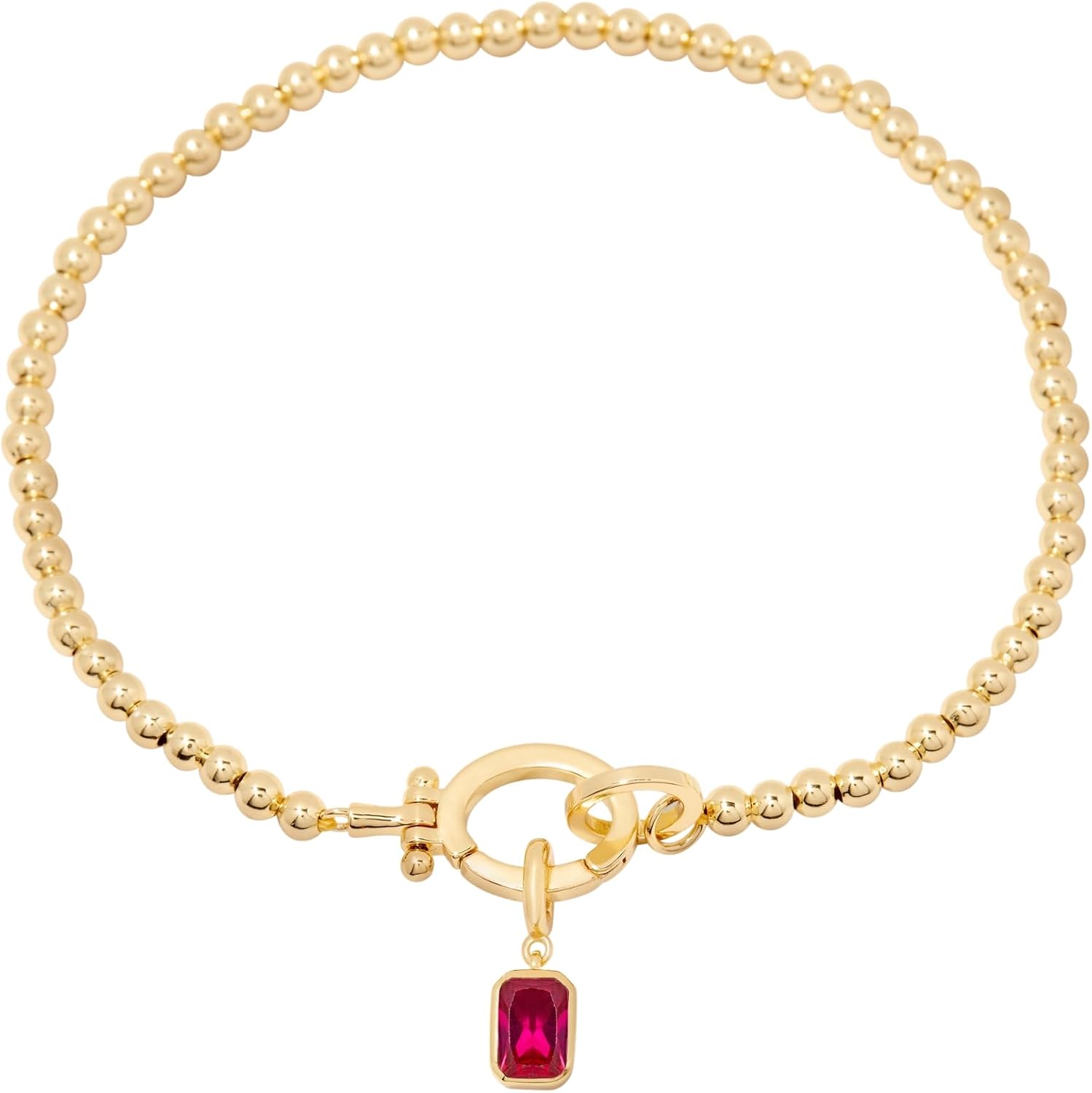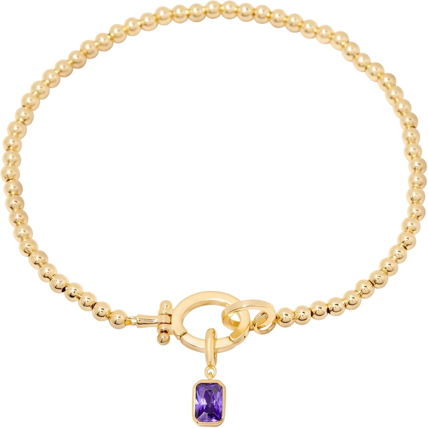 Treat your wrists to some bling with the Mackenzie Birthstone Bracelet. With a vivid birthstone charm, and intricately-beaded gold, this sparkling accessory is sure to add a touch of glam to any outfit. Avery Bracelet: Available in 14k gold plated or rhodium plated brass, 6.5" bead bracelet, hinge closure measures 1/2", 4mm beads Mackenzie Birthstone Charm: Available in 14k gold plated sterling silver or rhodium plated sterling silver1/8"x1/4" charm, 5mm Cubic Zirconia NOTE - open bracelet hinge to apply bracelet. DO NOT slide bracelet over hand and wrist. NOTE - Birthstone color may slightly vary per the color chart. SKU: BYB1233