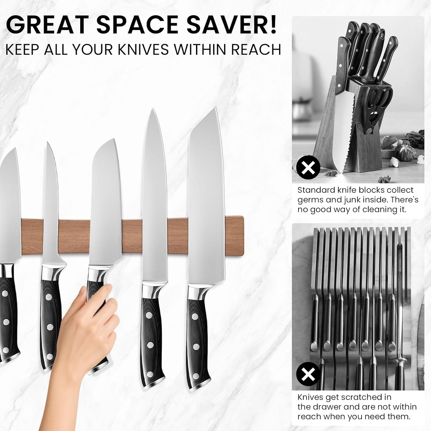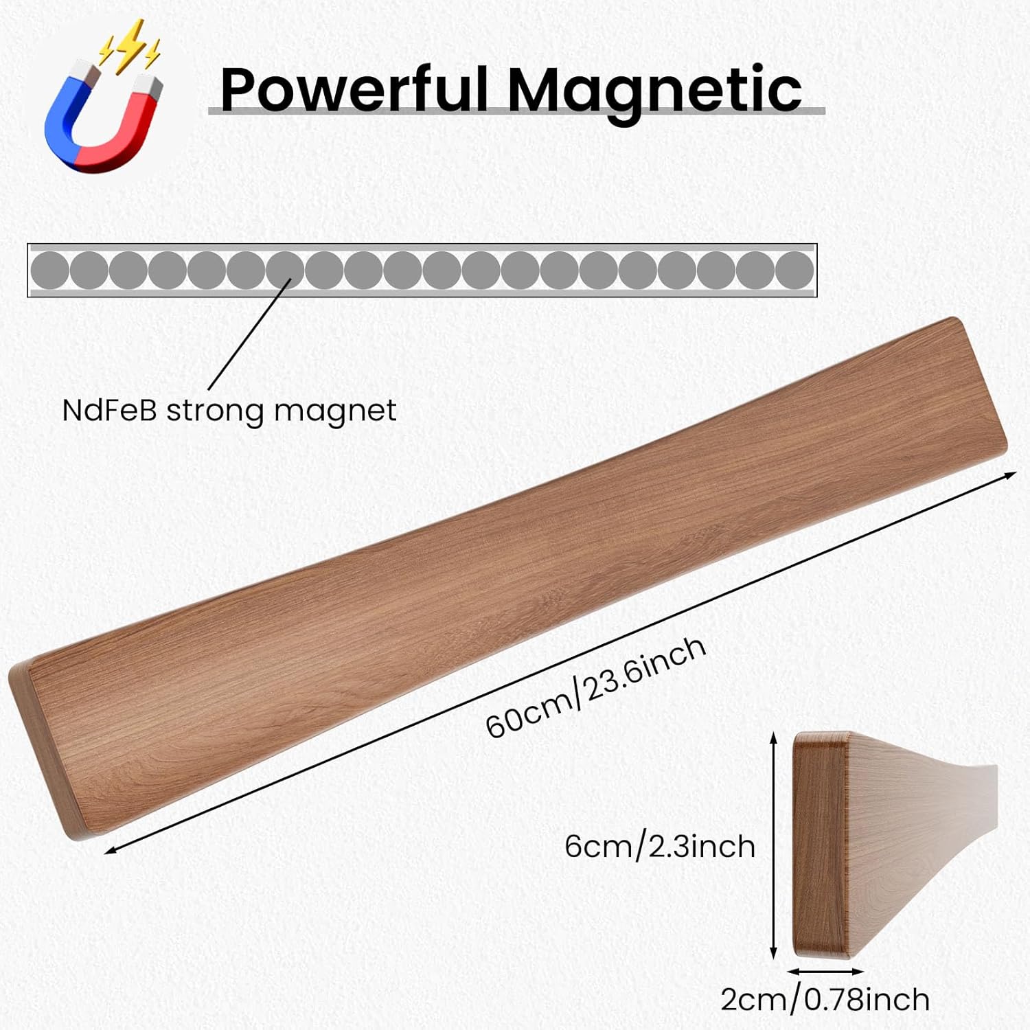 【Premium Wood】 This magnetic knife strips is made from premium African ash wood and features two rows of powerful magnets throughout. The enhanced grip keeps even the largest knives securely in place, making it incredibly sturdy and easy to clean. 【Stylish Design】 This wooden magnetic knife strips is perfect for your kitchen or any room you choose, adding a touch of style and elegance to your space. It's the perfect gift for any occasion. 【Extra-Long Size】 With an extra-long 24 inch surface area, our extended knife rack keeps all your cooking utensils within easy reach, reducing wasted space. It can be easily placed in any nook and cranny of your kitchen or workspace without taking up too much space. 【Punch-Free Wall Mount】 Our wooden magnetic knife strips offers two mounting options to suit different needs. Screws can be used to mount on any wall, while the double-sided adhesive tape is suitable for smooth, stain-free surfaces (excluding paint, plaster, plaster, and wallpaper). You can customize your knife rack and organize your kitchen to your needs. 【Multifunctional Storage】 The magnetic knife strips can be used as a kitchen utensil rack, home organizer, and metal utensil storage rack. It is an ideal magnetic knife strips for kitchens, utility rooms, laundry rooms, garages and other areas to store knives, scissors, children's toys, organizing tools, small toys and keys.