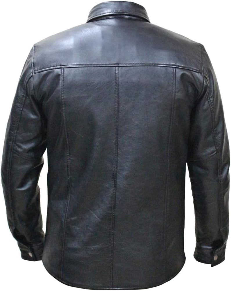 Men's Genuine Soft leather shirt. A light leather jacket that is ideal for cooler weather.Lightweight but heavy enough to wear on cooler than normal days. Our black leather snap-up jean style shirt is probably the hottest item because of the soft Genuine leather used to make it. This shirt is full cut with two chest pockets (snapped flaps) and has snap-on cuffs. This leather shirt is very soft.