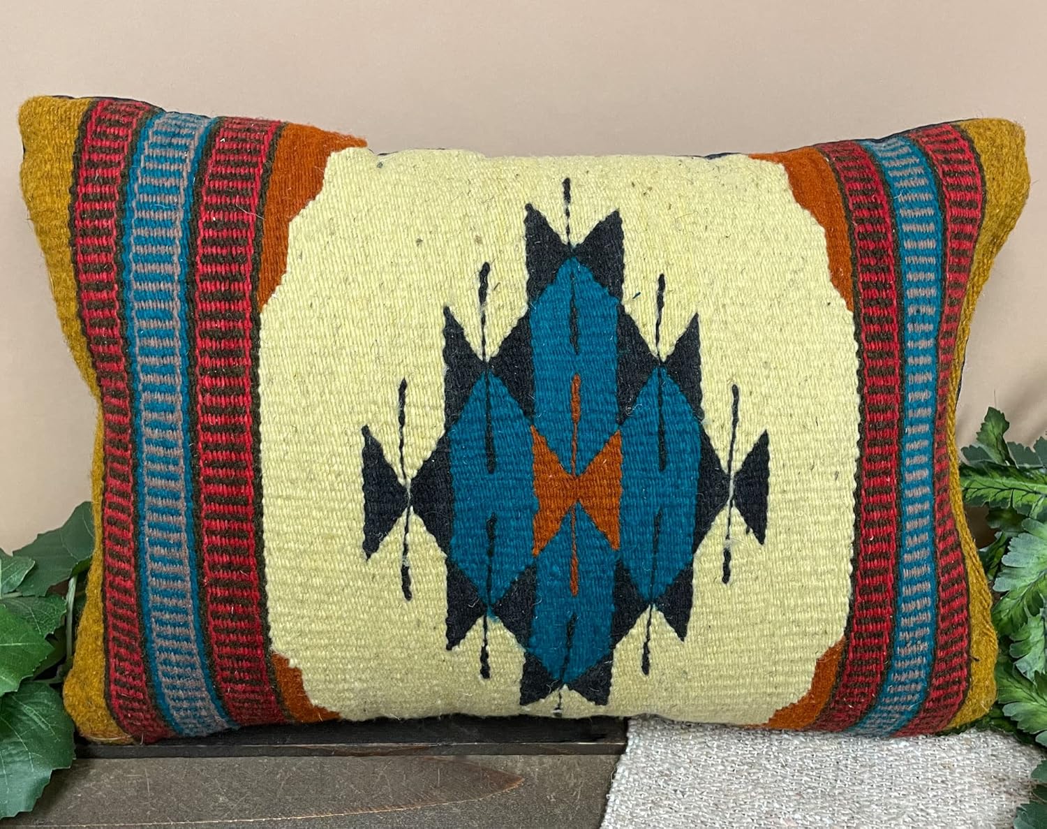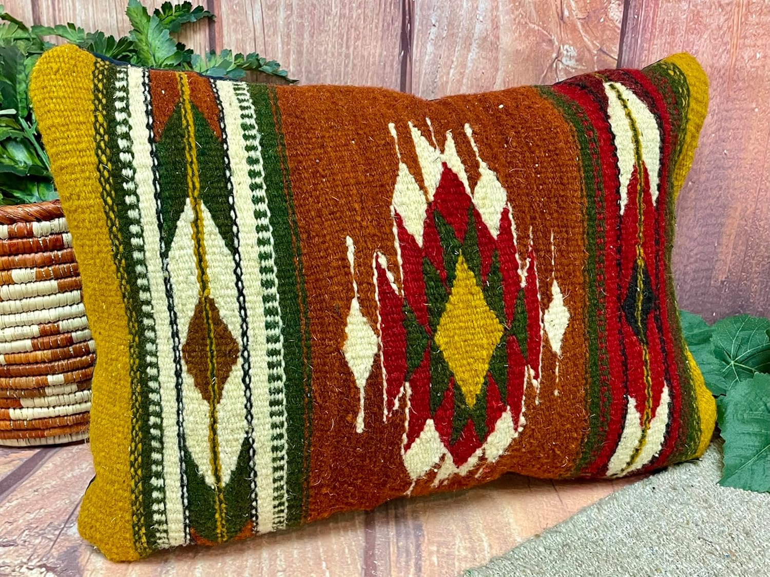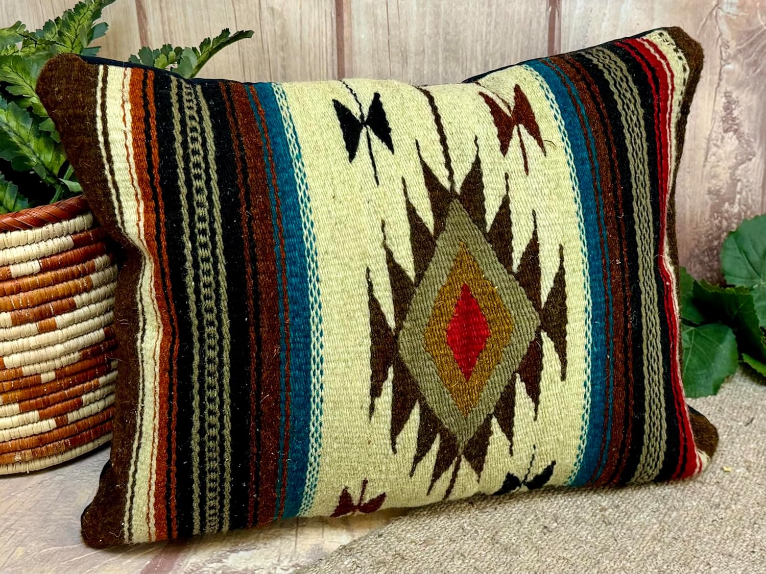 This is a hand woven wool southwest Zapotec Indian pillow perfect for Native American, western decor or southwest style home decorating.Woven by hand on a traditional loom by the famous Zapotec Indians, their weaving techniques and traditional Native pattern have been handed down for generations.Each Zapotec pillow is a unique one-of-a-kind treasure. Created with stone ground dyes and varying patterns, no two are exactly alike. The back side of this pillow is fabric.Measures approximately 12x16, 100% Zapotec wool front.