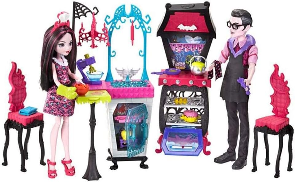 This Monster High play set features Draculaura doll, Dracula doll and a kitchen setting ready to host a feast for two. Dracula's home kitchen includes a stovetop and oven piece, a sink with refrigerator below and a table with chairs for two. The design includes popular colors, iconic details (like spider webs, lots of bats and a glam chandelier) and working features like a door that opens and closes on the refrigerator. Fun food accessories help spark stories and include a mixer, pots, pans, desserts and even a menu.