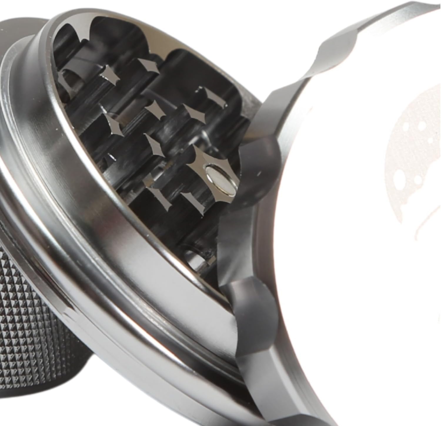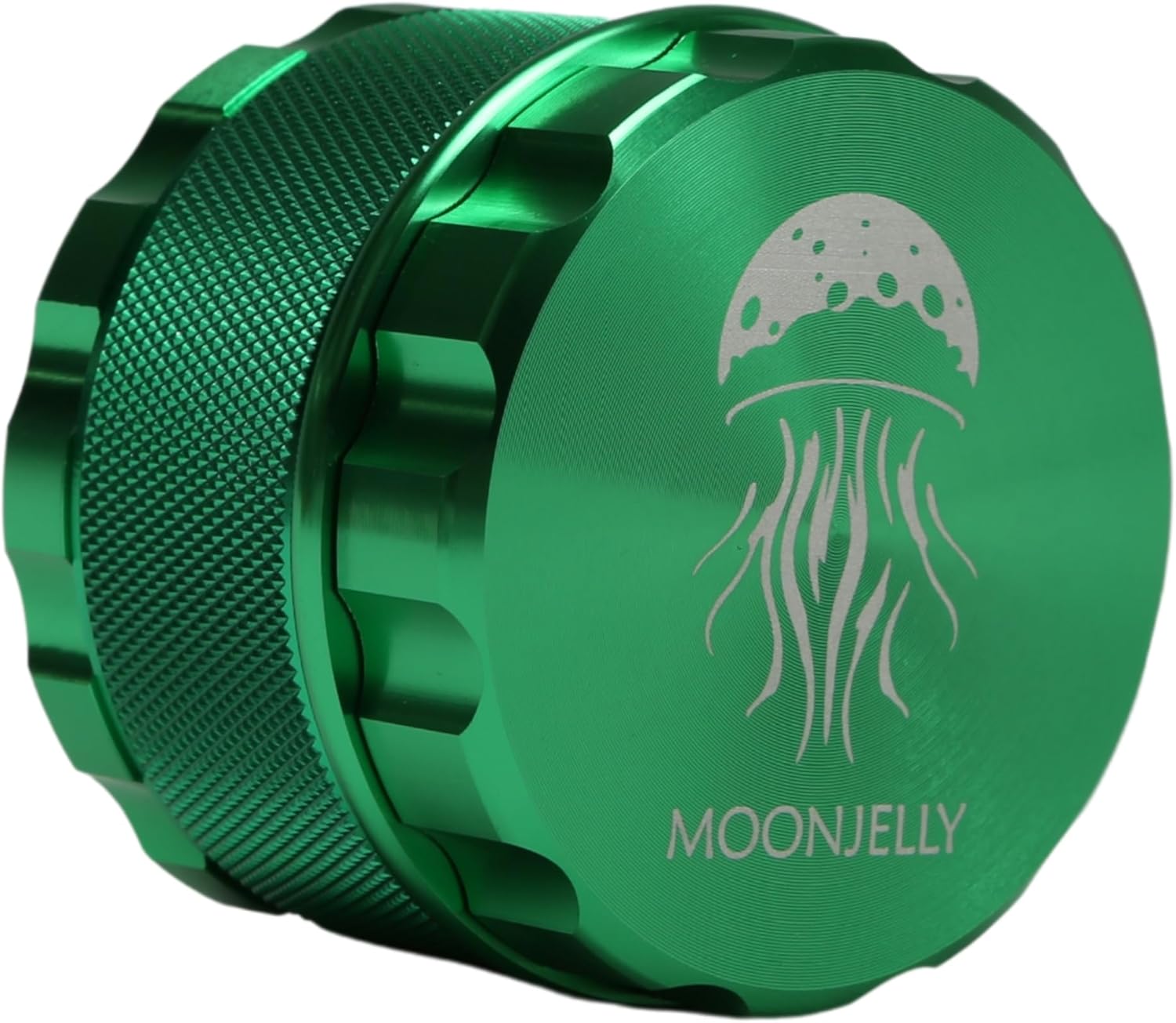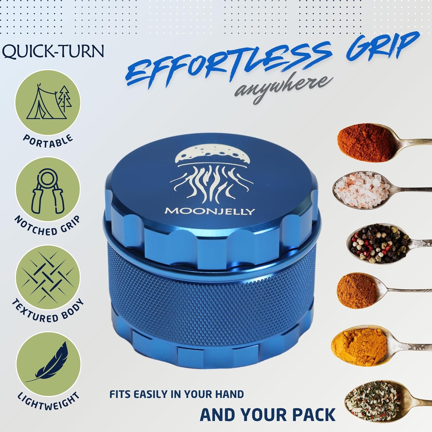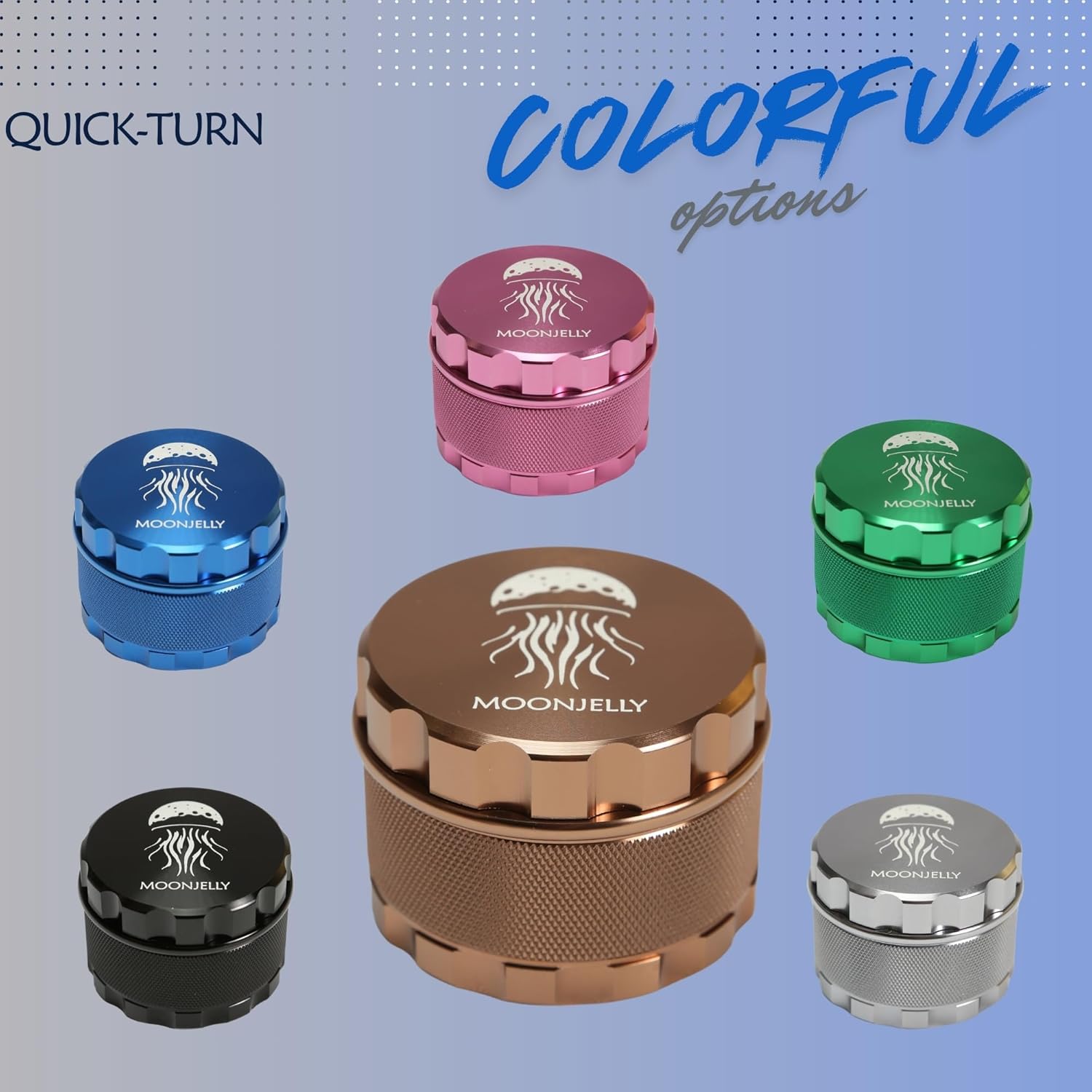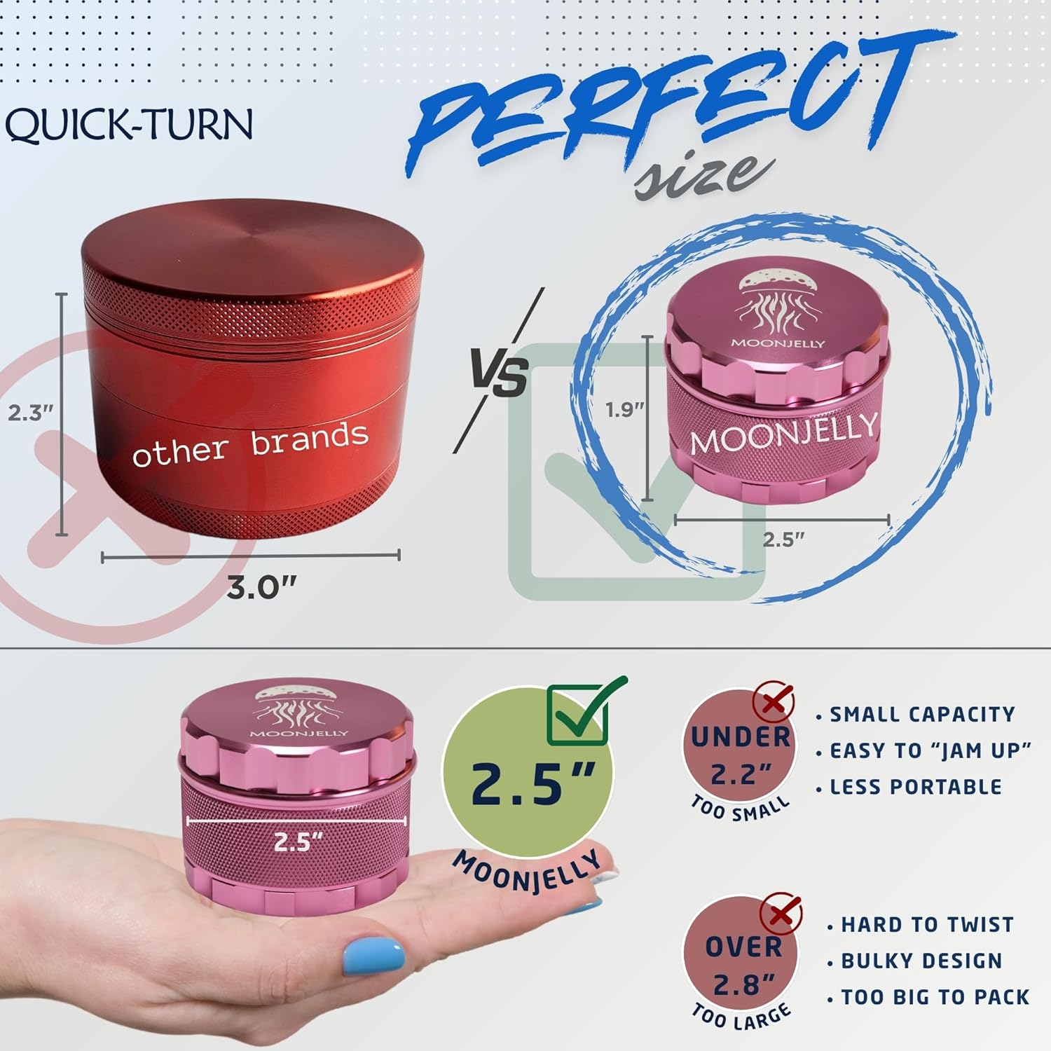 The MOONJELLY 2.5" Quick-Turn Grinder mill features a rapid-access quick-turn lid, notched grip points, and a textured mesh body for ultimate control. Sharp aluminum teeth provide a smooth, consistent grind, while a secure magnetic lid locks everything in place for a clean, efficient experience.