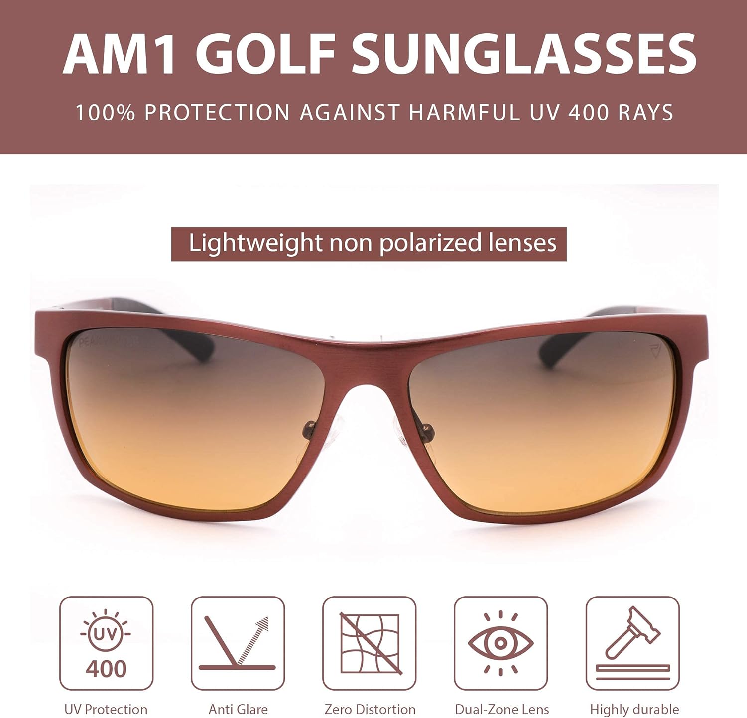 Experience Super Light and Comfortable AM1 Sunglasses with Patented Dual-Zone Lens Technology! PeakVision is known for its patented Dual Zone Technology. The PeakVision lenses were designed by J-Paul Moore to eliminate distortion within sports optics. It took him over four years to prototype and design the PeakVision dual-zone lens, which he dubbed to be the perfect lens for golf, tennis, biking and many other sports. Dual-Zone Hybrid Optics: For improved vision in both extreme lighting fields including bright sky, dark turfs, and terrain below the horizon. Upper 20% Neutral Gray: For protection from harmful UV rays, enhancing long-distance visibility, lessening the fatigue, and minimizing eye strain. Lower 60% Contrast Amber: For enhanced clarity and providing 3X visual information making every whole on the ground clear. Our sunglasses are designed and fabricated with advanced technologies helping you to get a clear vision with style. The following features are: Anti-Reflective Backside Coating & Oleophobic Smudge-Resistant Coating: For repulsion of dirt, water, and oil making sunglasses easy to clean. RA filters: For combating against glare from all angles and enhanced clarity. Zero Distortion: For ultra-clear view AM1 is made up of incredibly light and durable material- aluminum magnesium. It provides lightweight durability while driving and golfing. They are comfortable with a perfect grip that fits the face of any size. Expand your vision with AM1 both on and off the field. AM1 comes in cool and unique colors which add a style quotient to your personality. It comes in: Gloss Black Gloss Brown Gloss Navy Blue & Orange AM1 sunglasses come with a high-quality EVA case to keep your eyewear safe. Add to Cart now!