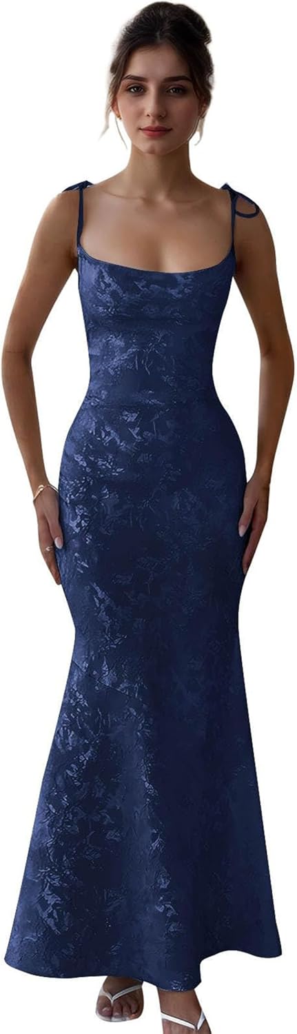 Make a stunning entrance in this sophisticated mermaid evening gown featuring delicate tie shoulder straps and an exquisite floral jacquard pattern throughout. The form-fitting silhouette gracefully flows into a dramatic flared hem, creating an elegant and flattering profile. The corset-style back with lace-up detail adds a romantic touch while ensuring a perfect fit. Available in ethereal shades is perfect for formal events, proms, or special occasions. The square neckline and shoulder ties offer adjustable support and a feminine appeal, while the premium fabric creates a luxurious sheen that catches the light beautifully. The dress's thoughtful design combines timeless grace with modern sophistication, making it a versatile choice for any formal gathering. The floor-length cut and fitted bodice work together to create a sleek, streamlined appearance that celebrates feminine curves while maintaining elegance and refinement.