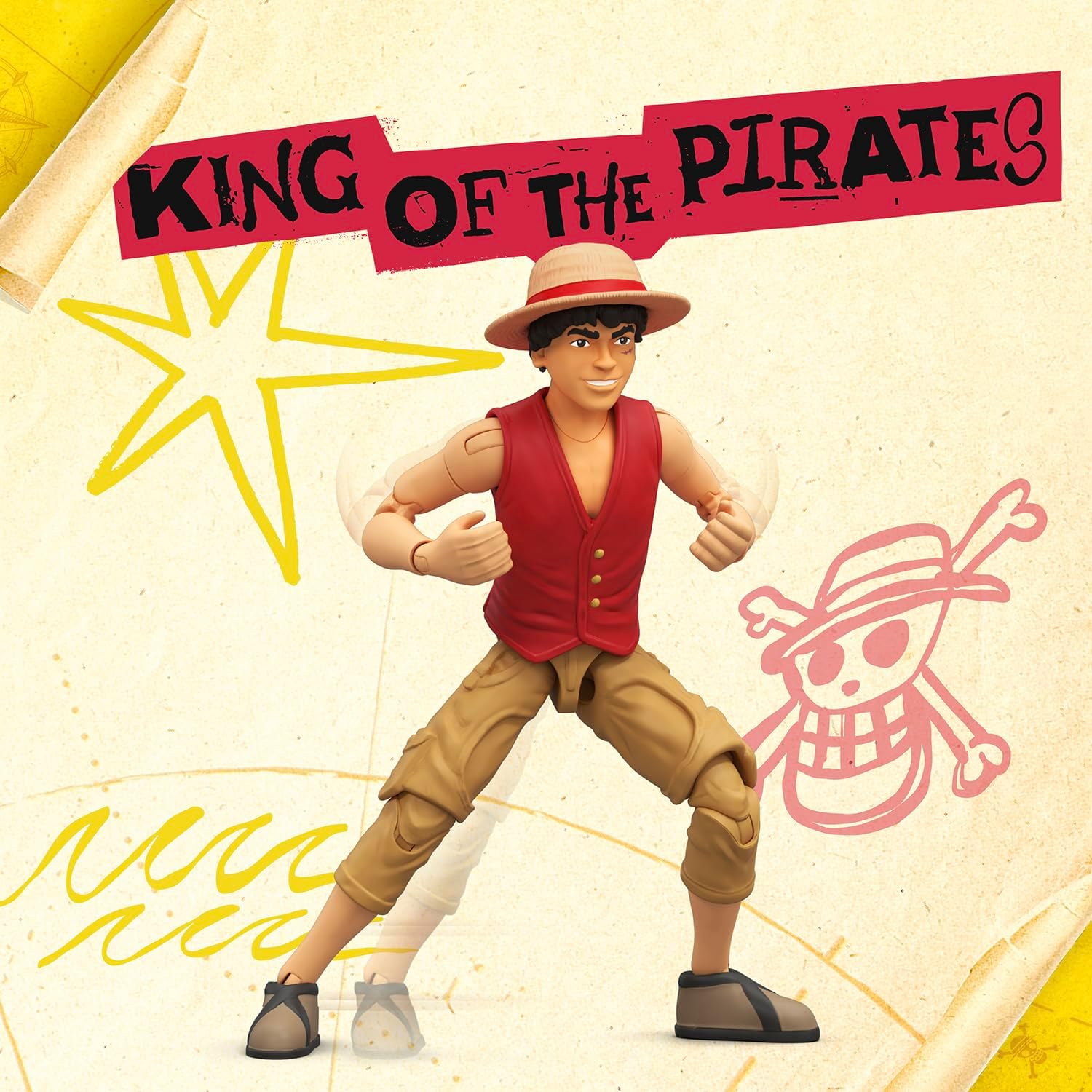Set sail with Monkey D. Luffy, from Netflix's live-action hit series One Piece. Capturing the adventurous spirit of the future King of the Pirates, this collectible figure brings Luffy’s boundless energy to life with 22 points of articulation, letting you strike iconic poses straight from the show. Packed with 6 exciting accessories, the figure includes 4 swappable stretched arms and legs for Gum-Gum battle stances, a Wanted: Dead or Alive poster, and a berry coin display base. Standing at 6" (15 cm) tall, Luffy is ready to take to your display shelf or his next adventure on the high seas. Collect the full crew: Zoro, Wapol, and Chopper, and recreate unforgettable moments from the Netflix adaptation that brought Eiichiro Oda’s legendary manga to live action. Whether you’re a long-time Straw Hat fan or new to the Grand Line, this Luffy figure is the ultimate treasure for your collection.