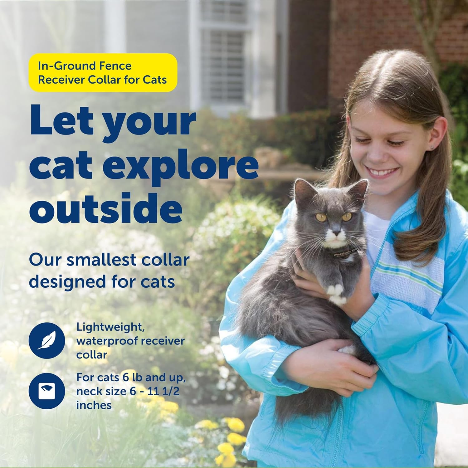 The PetSafe In-Ground Cat Fence is a customizable, long-lasting solution designed to create a secure play area tailored to your yard and your outdoor cat's needs. This invisible pet containment kit includes 500 feet of durable fencing wire, enough to cover up to 1/3 acre, and can be expanded to 25 acres with the purchase of additional wire, making it ideal for both small and large outdoor spaces. The waterproof, battery-operated receiver collar features a tone-only mode for training and four adjustable static correction levels, making it easy to tailor the training to your cat's temperament. The collar is designed to fit neck sizes from 6-11.5 inches, ensuring a secure and comfortable fit for cats 6 pounds and up, 6 months and older. Visual cue boundary flags help guide your cat during the training process. This multi-pet training system supports additional collars for households with more than one cat. With its reliable, expandable fence design and customizable settings, the PetSafe Basic In-Ground Fence System is a trusted, DIY-friendly electric fence that keeps your pet safe, happy, and free to roam. Since 1988, PetSafe has been driven by a simple belief: safe, healthy pets lead to happier lives for pets and their families. For over 25 years, we've been dedicated to enhancing the lives of pets and the people who love them, treating every pet as a cherished family member and delivering life-changing innovations designed to enrich every moment. With U.S. roots and a global reach, our vet- and trainer-recommended products are built for every pet and backed by exceptional customer support. From backyards to dog parks, we're on a mission to create fields of joy for happy, healthy, and safe pets.