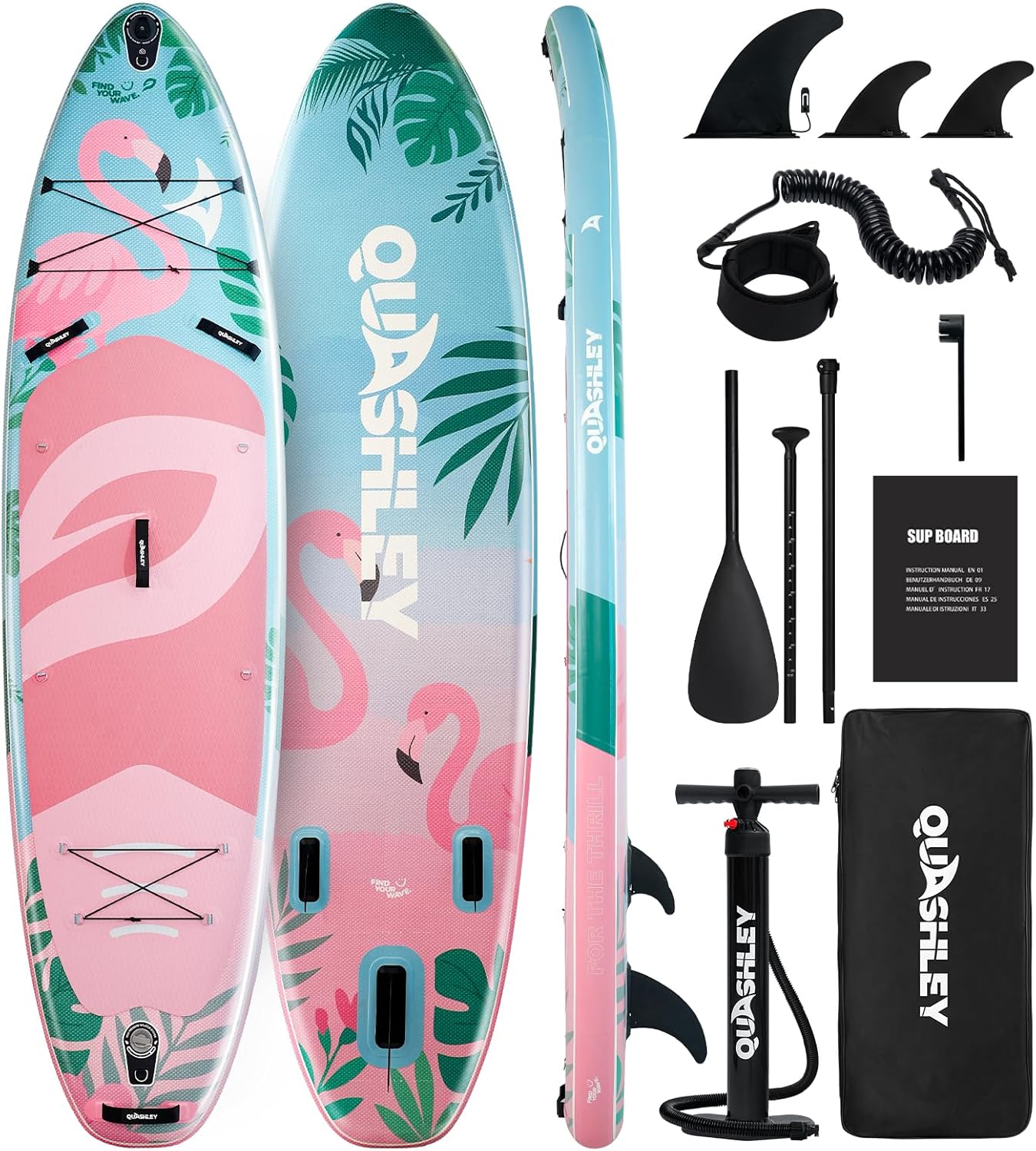 For the Thrill, Find Your Wave with QUASHLEY! Engineered by paddleboard enthusiasts, our 32"x11'x6" inflatable SUP board delivers unmatched stability and agility for beginners to pros. Whether you're kayaking solo, practicing yoga, fishing with kids, or adventuring with your dog, this triple-layer PVC paddleboard withstands rocky shores and UV rays while staying ultra-lightweight. Why Choose QUASHLEY? Factory Direct Durability: As a manufacturer-owned brand, we use military-grade PVC and hand-checked seals – zero leaks guaranteed. Stability You Can Trust: Wider 11' deck + non-slip EVA pad holds 330 lbs (perfect for adults + kids/pets). Portability Solved: Folds into a compact backpack (fits in car trunks/airplane cabins) – no more storage headaches! Fast Setup: Dual-action pump reaches 10-12 PSI in 8 minutes (no over-inflation anxiety). Package Includes: 1x Paddle Board, 1x Adjustable Aluminum Paddle, 1x Dual-Action Pump, 1x Backpack, 1x Ankle Leash, 1x Paddle Leash.