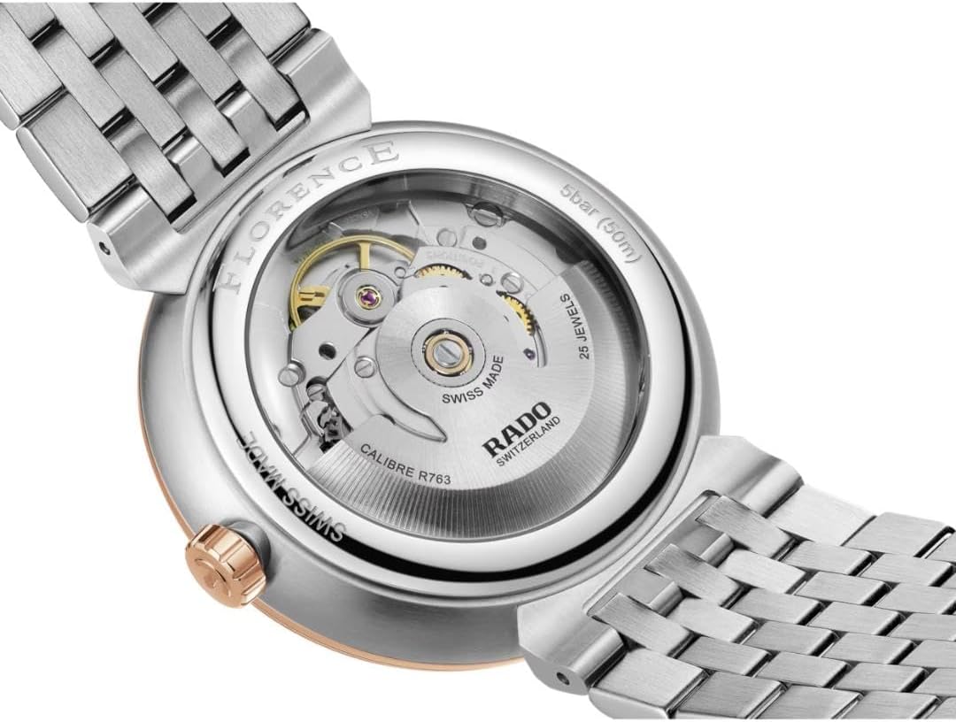 Discover the timeless blend of Swiss precision and elegance with the iconic Rado Florence. The 39 mm case is crowned with an edge-to-edge sapphire crystal, featuring a black metallised edge that matches the dial. This sapphire crystal functions both as the protective front and as a bezel, seamlessly integrated into the case to enhance the Florence iconic refined profile. Serving as a theatre scene, the black dial showcases extreme attention to detail with its sophisticated embossed pattern. The contrasting rhodium coloured applied hour markers, topped by the moving Rado anchor symbol, finished with brushing and polishing, create a hypnotising contrast against the black background. The case is complemented by a stainless steel bracelet, featuring brushed and polished links, and is secured with a stainless steel three-fold clasp. Beneath the box-shaped sapphire crystal case back lies the soul of the Florence: the Automatic R763 calibre. Finely regulated in five positions and featuring a Nivachron™ hairspring, this movement delivers a high level of accuracy and a robust 80-hour power reserve, underlining Rado's commitment to perfection.