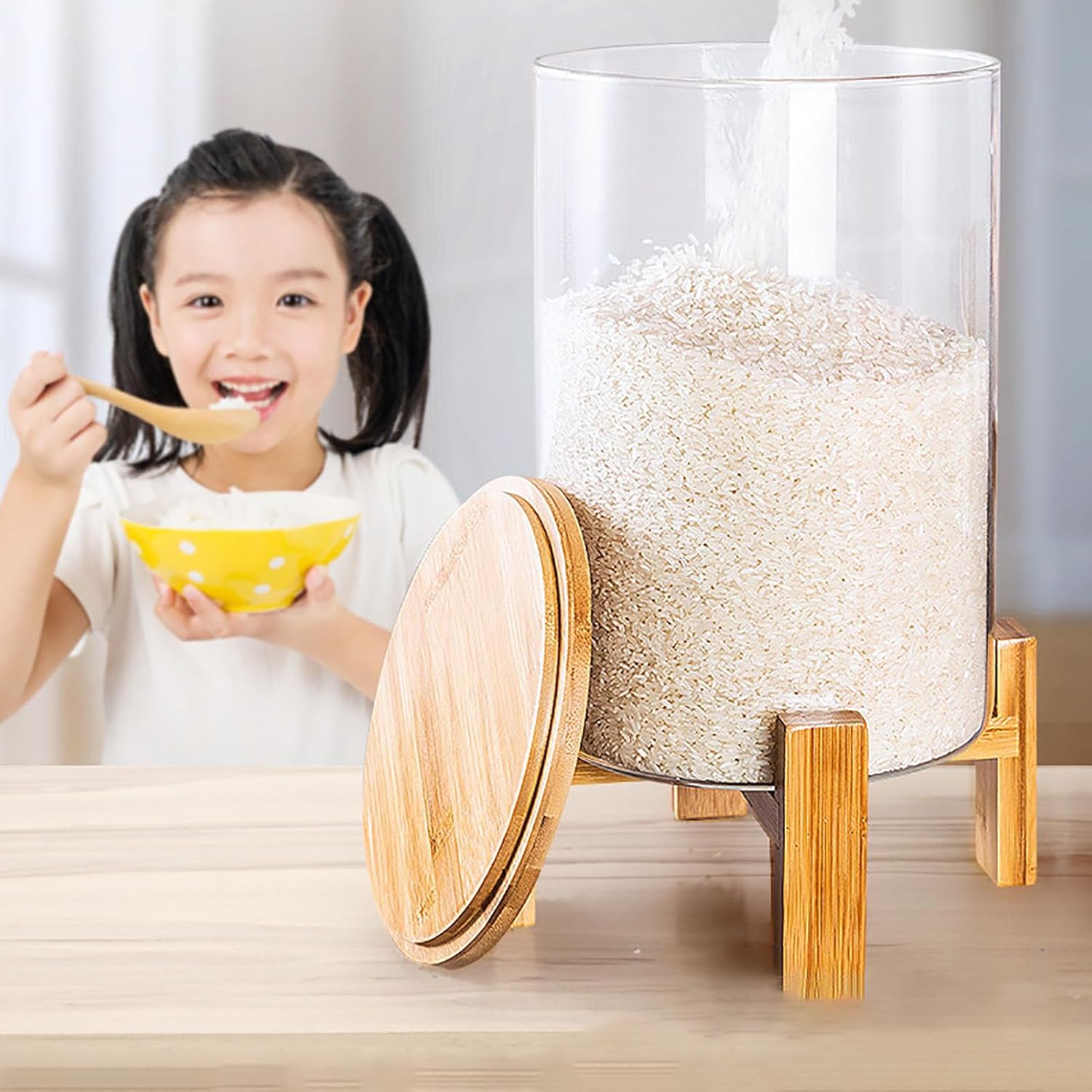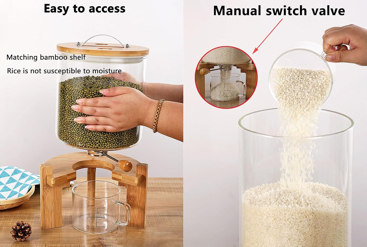 ★ Features:1. The glass rice container with sealed lid and wooden stand.2. Stylish design, keeps the kitchen /pantry organized.3. The rice storge container features a wide mouth opening, making it super easy to fill and clean.4. The lid has a stainless steel handle for easy move.5. There is a rice outlet design at the bottom of the cereal container. The rice/beans can be smoothly released by manually switching the valve.6. Manual air release valve - When opening / closing the top cover, the valve must be lifted manually to release the seal.★ Specification:Product name: rice/cereal/beans/pet food containerCapacity: 5L/7.5LSize: 5L - Caliber: 20cm, Hight: 35cm(with stand); 7.5L - Caliber: 20cm, Hight: 45cm(with stand)Material: Glass+Bamboo woodFunction: sealed/fresh-keeping/moisture-proof/dust-proof★ Package includes:1*Glass rice dispensers1*Measuring cup
