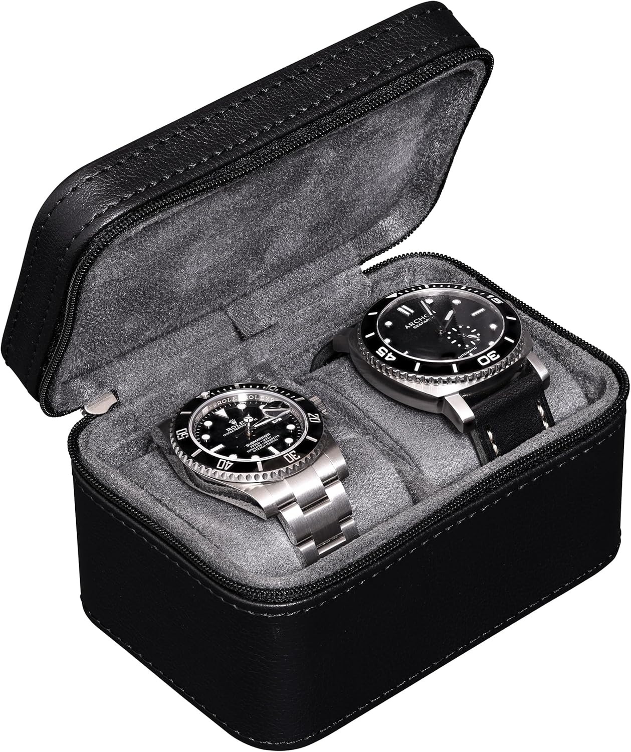 The ROTHWELL Double Watch Travel Case for Men combines durability and style, featuring a premium PU leather exterior with a microsuede interior to protect your valuable timepieces. Whether you're storing two watches for travel or as a safe spot for your collection, the adjustable pillows ensure a snug fit for any watch up to 55mm. Perfect for business trips, weekend getaways, or everyday use, this compact, lightweight case keeps your watches secure and accessible. It’s a must-have for any watch lover and a thoughtful gift for any occasion.