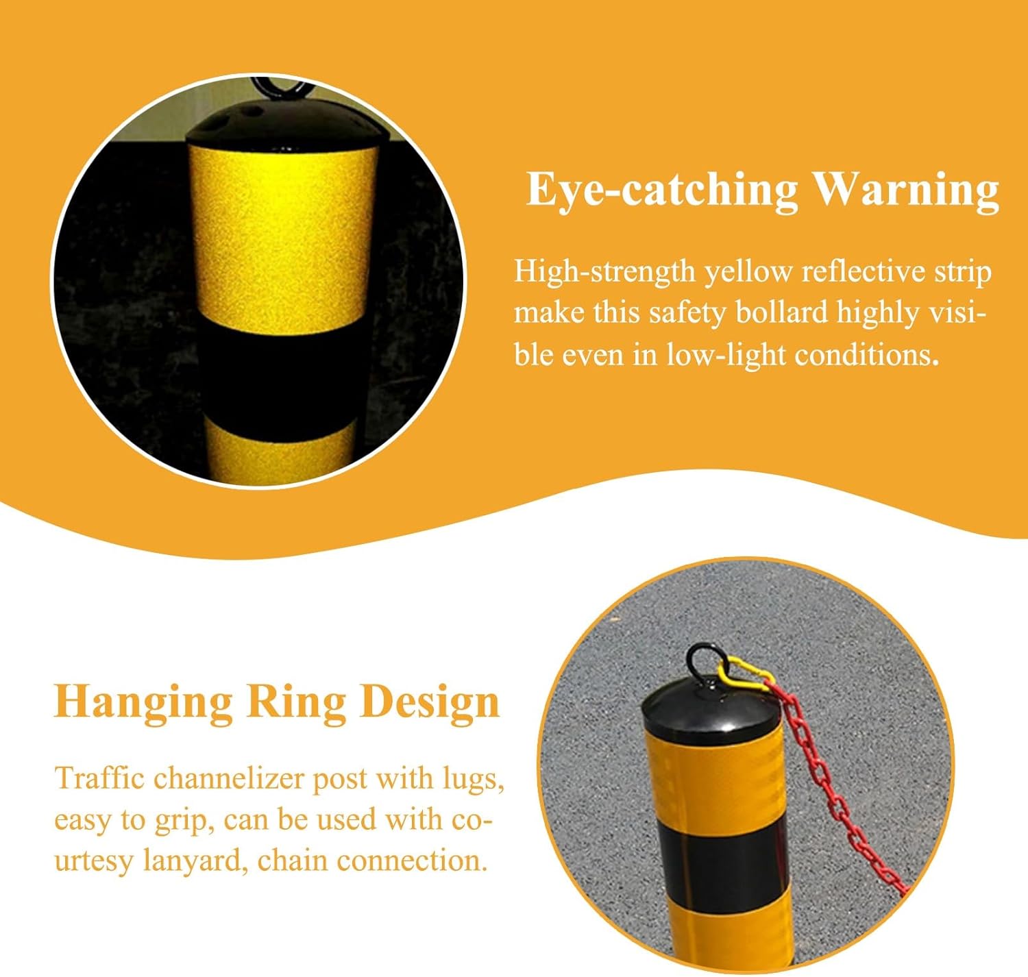 Lockable Parking Safety Barrier:- Wondering which delineator bollard will fit your needs? - Bollard covers a variety of uses in different environments,from solving annoying parking lot hassles to improving asset protection. Eye-catching color draws the people's attention in dimly lit environments,preventing accidents,injuries,and property damage. Specifications: - Material: Steel - Post Size: Dia 11.4cm( 4 1/2" ) - Base Size: Dia 16.5 cm( 6 1/2" ) - Post Wall Thickness: 2mm( 0.08" ),2.5mm( 0.1" ) - Post Height: 50cm( 19 3/4" ),75cm( 29 1/2" ),100cm( 39 3/8" ) - Installation: Ground Mount Features: - Made of steel,sturdy & durable for long- term use. - Heavy duty base enhances stability and solidity. - Warning stripes ensure nighttime visibility & increase safety. - Hanging ring design,portable,can be used with chain. - Bollard post has pre-drilled holesfor easy installation. - For driveway,parking lot,sidewalk,bike lane,etc. - Used for traffic delineation,crowd control,warn of danger. Package Contents: - 1 x Safety Bollard - 4 x Screws Notes: - The color may exist a slight difference due to different screen displays. - Manual measurement,please allow slight errors on size. Quality Services: - If there is any question about the product,please do not hesitate to contact us,we will reply you promptly.