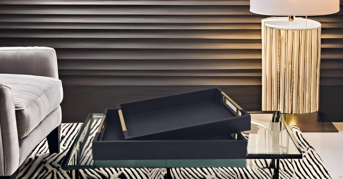 Set of 2 quisite rectangular decorative tray features a modern and elegant design with a glossy grey faux shagreen leather finish. It is versatile for use as an ottoman tray, coffee table accessory, or serving tray in various settings such as the living room, bedroom, or kitchen. The tray is accentuated by polished gold metal handles, enhancing its luxurious appearance.
