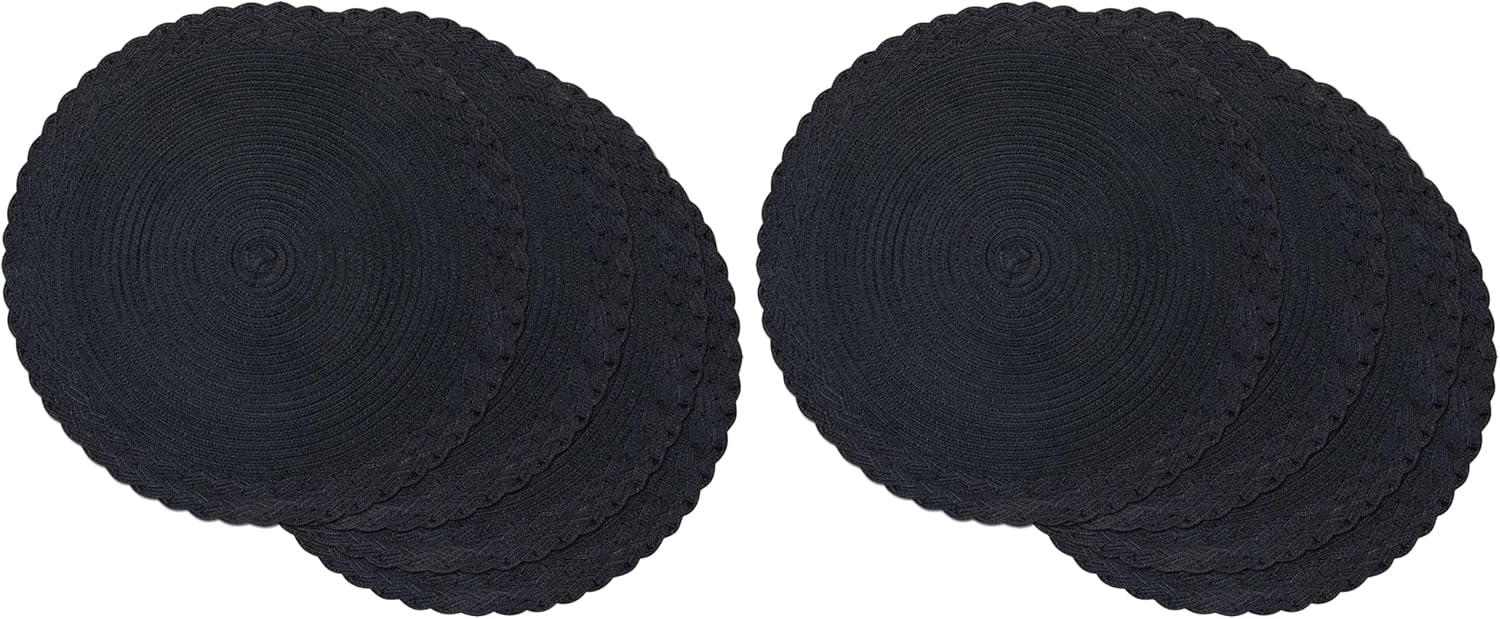 SHACOS Round Braided Border Placemats Set of 6 Circle Circular Table Mats Navy BlueOccasion: Suitable for everyday use, holidays, catering events, showers, wedding, housewarming and so much more. A pleasant gift for your family, friends, and neighbors.Material: 60% cotton and 40% polyesterSize:15 inches in diameterPacking List:6 pieces place matGreat Table Protection and DecorationMultiple bright colors are available to decorate your dining table on different festival. The Bohemian style braided brim design brings quite different amorous feelings for your dining room.Multiple UsageIn addition to protecting and decorating your dining table, these kitchen table mats can also be used as art pieces when combined with other items. Warm Notice1. The placemat are shipped floded in half. If there is a crease on it, just allow it to rest for several days, reverse rolling the mat or put heavy things on the crease. Steam iron below 80 degrees.2. Not waterproof. No machine wash.