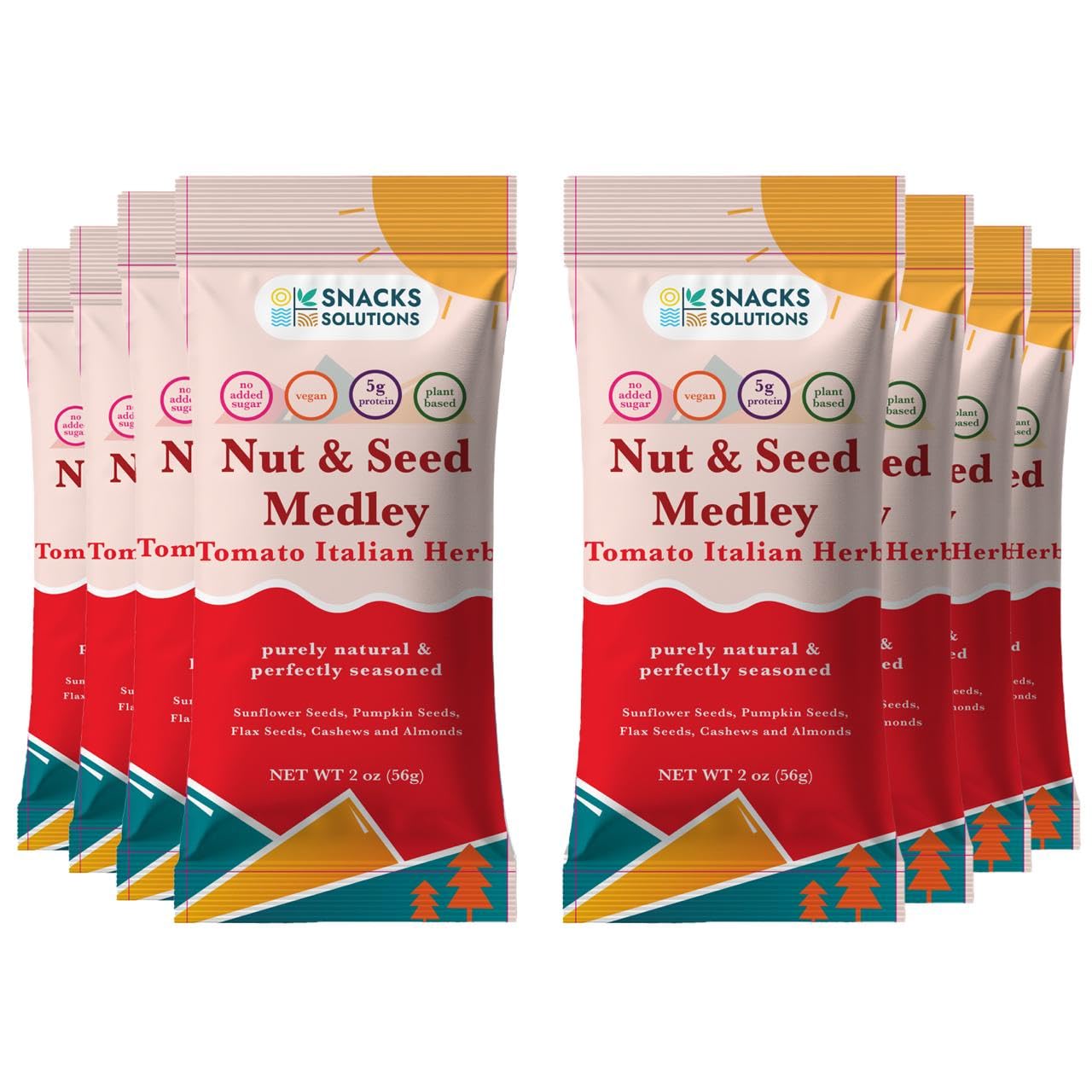 Elevate your snacking with Snacks Solutions Organic Nut & Seed Medley, a flavorful blend of sprouted sunflower seeds, pumpkin seeds, cashews, and almonds. this medley is gently dried to keep nutrients intact while delivering the perfect crunch. Each serving provides 5g of plant-based protein and essential minerals such as magnesium, iron, and potassium, making it a wholesome, energizing snack for active lifestyles. USDA Organic certified, vegan, gluten-free, kosher, and made with no added sugar or preservatives, it’s a clean-label snack you can trust. Enjoy it straight from the pouch, sprinkle over salads, or mix into your favorite recipes for a nutritious boost. With purely natural & perfectly seasoned ingredients, Snacks Solutions brings you just real, living food with bold Italian-inspired flavor.